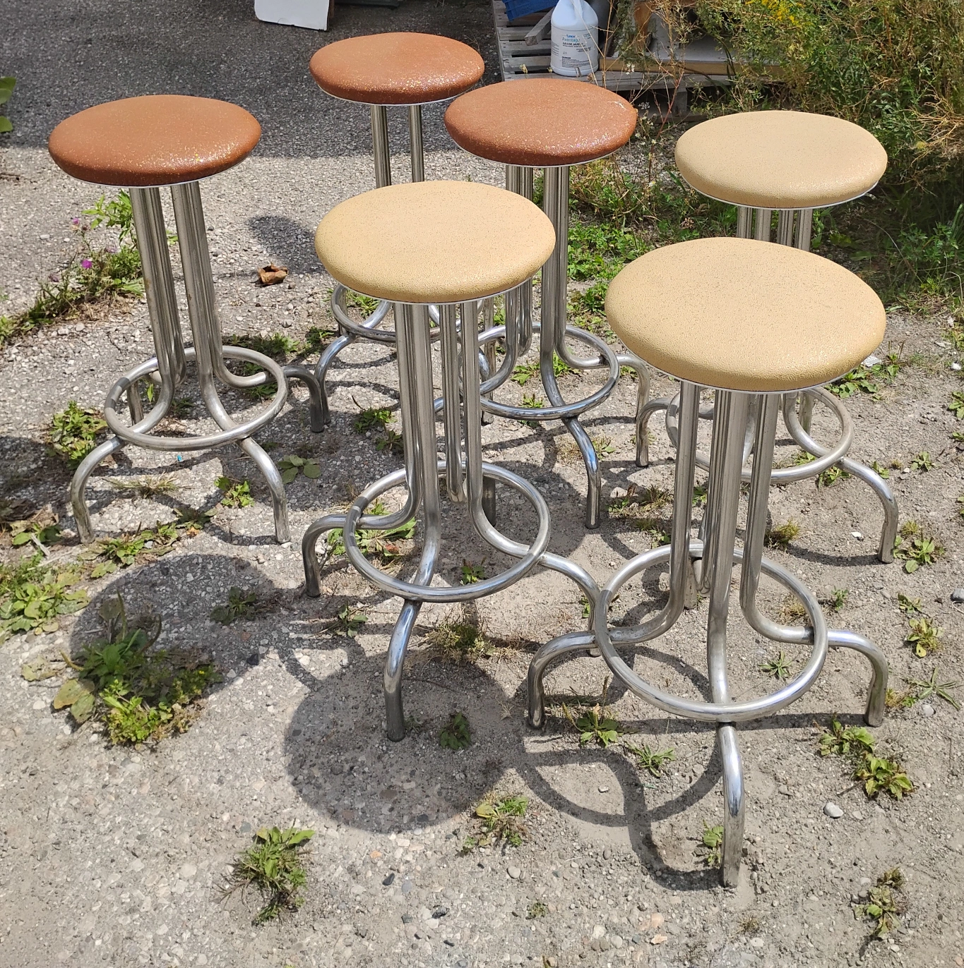 Selling a set of six bar stools. They feature chrome frames and vinyl seats in a mix of tan and brown colours. These stools would be great for a home bar or kitchen island!