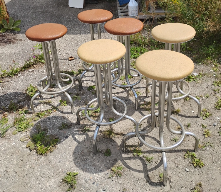 Selling a set of six bar stools. They feature chrome frames and vinyl seats in a mix of tan and brown colours. These stools would be great for a home bar or kitchen island!