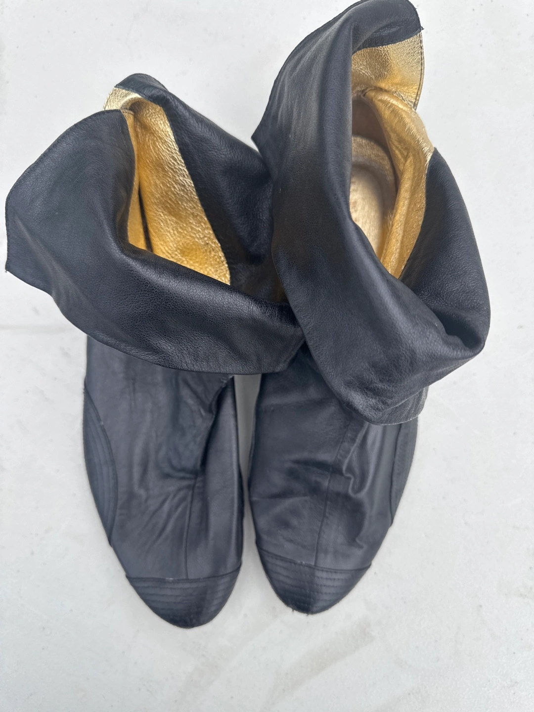 Selling a pair of black leather boots, size 11. They have a unique style and are in good condition with some signs of wear on the soles. Perfect for adding a bit of edge to your wardrobe!