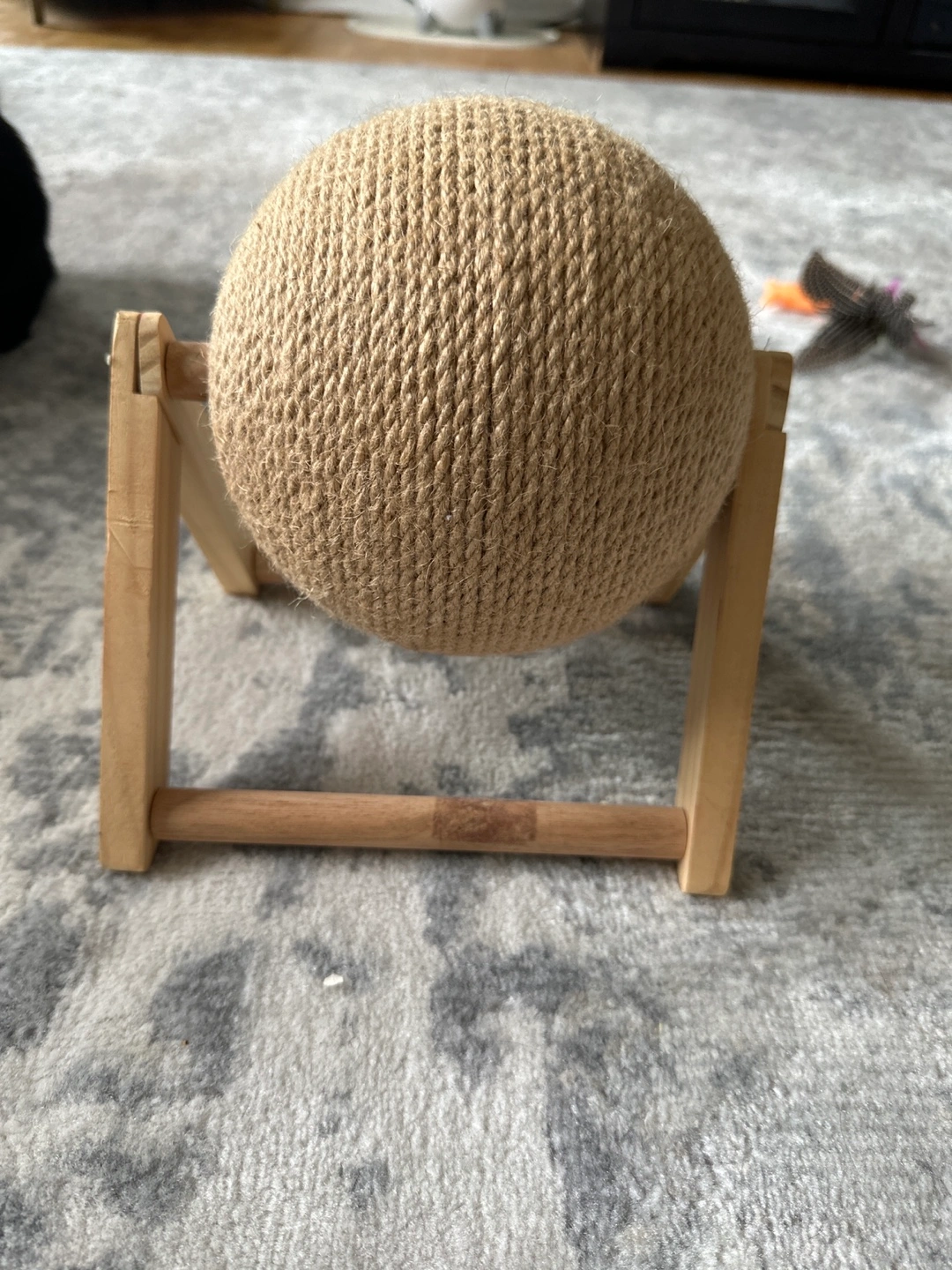 Here's a fun cat scratching ball toy! It's in great condition and ready for a new home. The ball is covered in a durable woven material, perfect for scratching, and it sits on a sturdy wooden frame