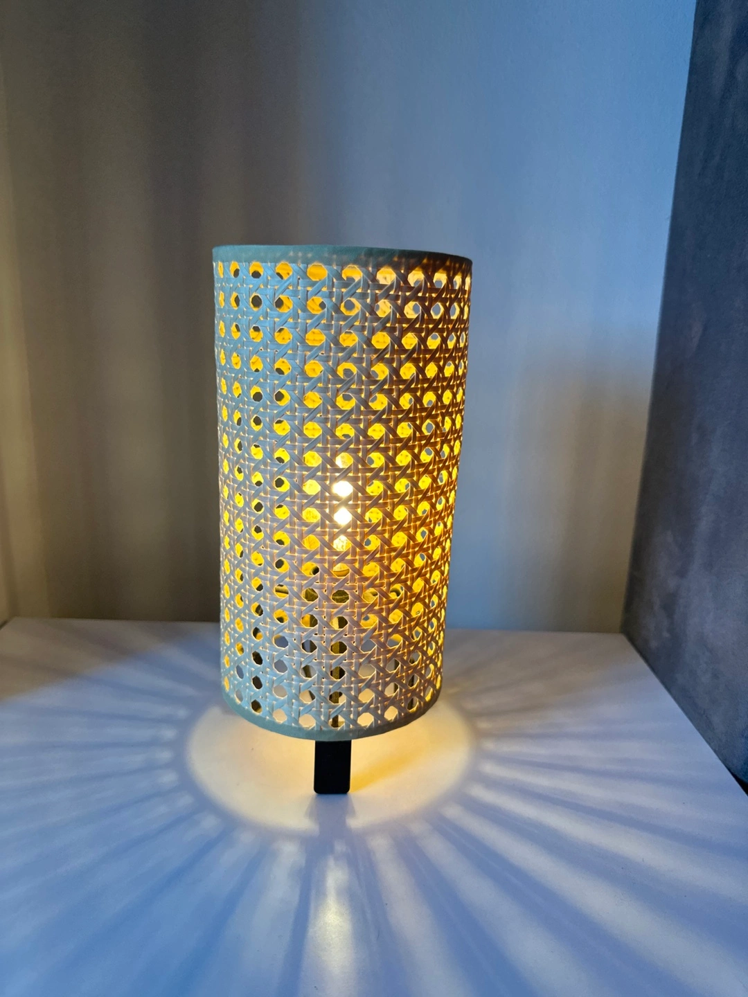 Here's a cute rattan table lamp that would look great in any room! It gives off a warm and cozy glow. Its neutral colour makes it easy to match with any decor