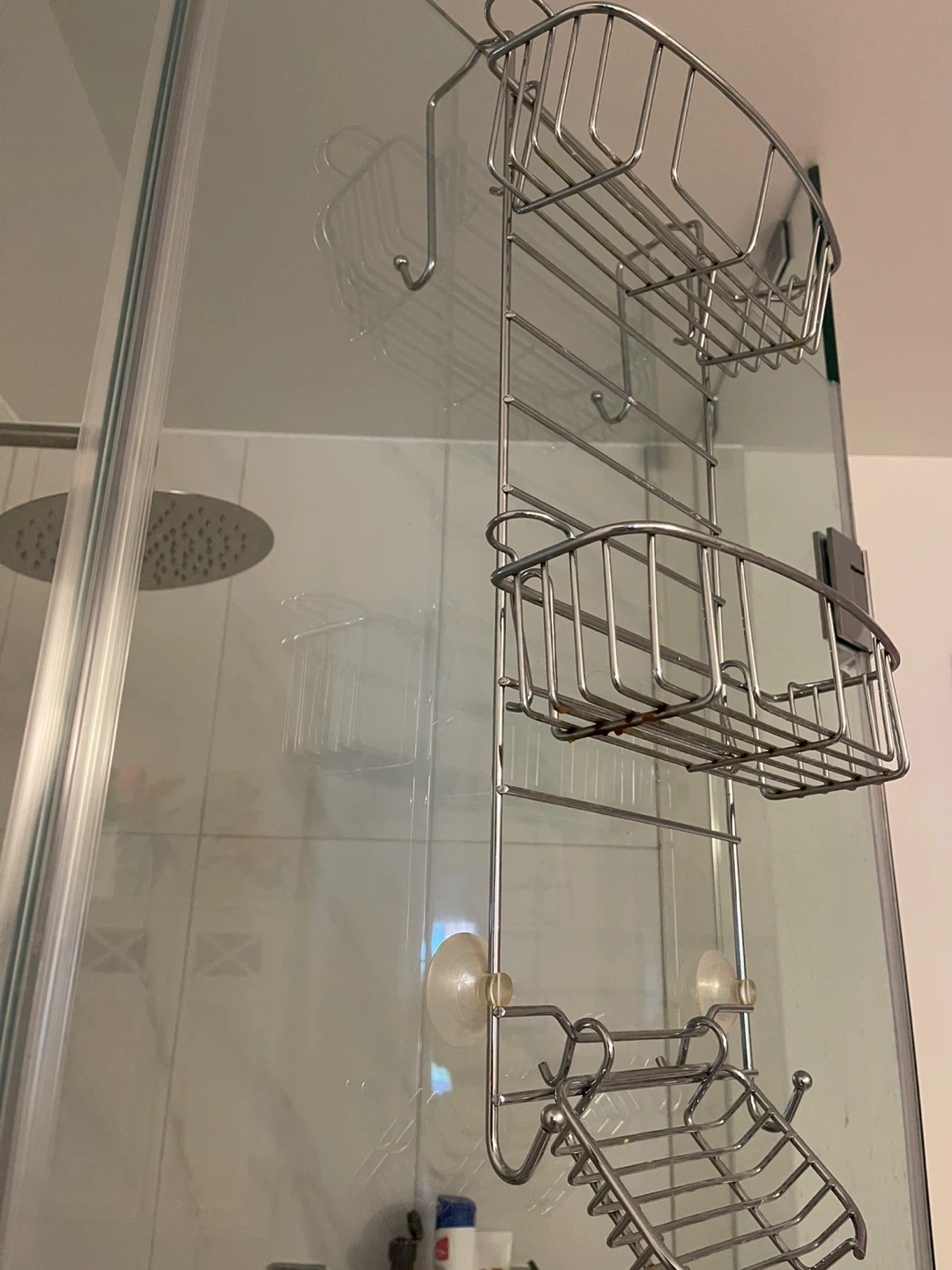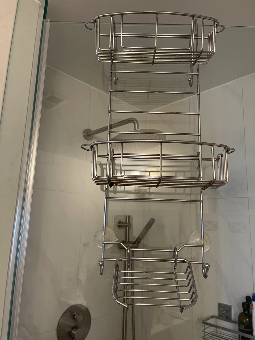 Selling a shower caddy in great condition! With multiple tiers and hooks for razors or washcloths. It has suction cups to keep it steady on the shower wall