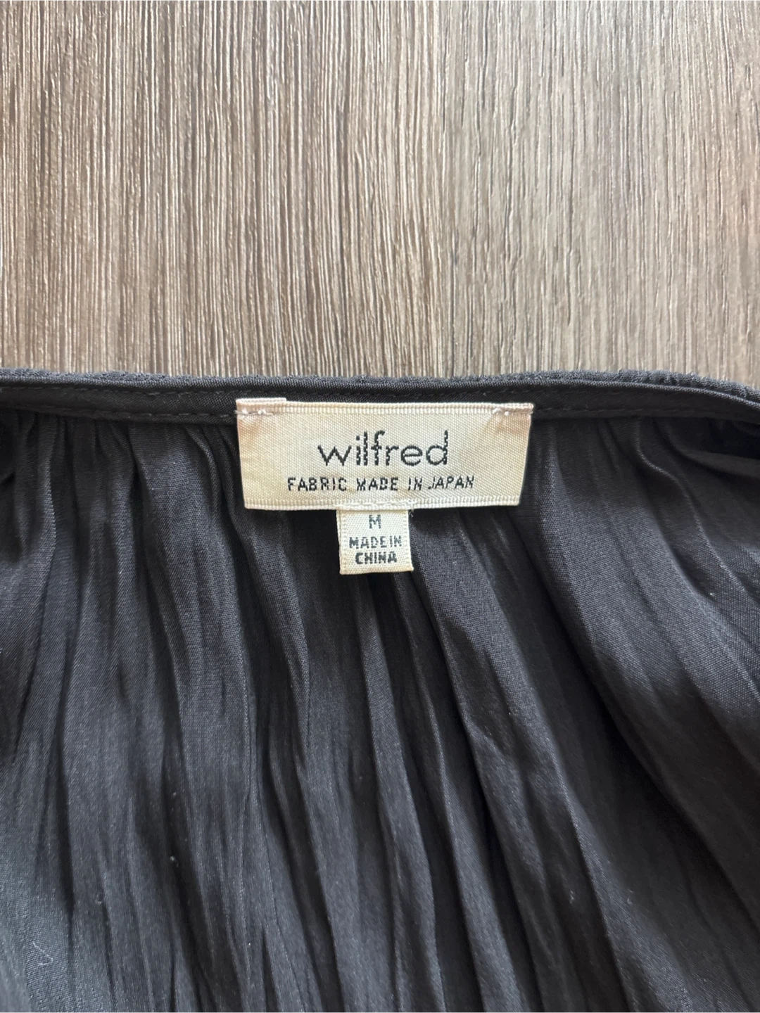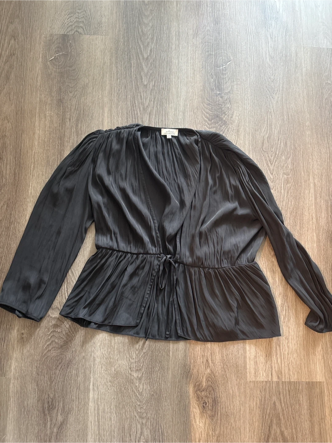 A lovely black blouse from Wilfred in size medium! It features a tie at the waist and a flowy design. The fabric has a subtle texture that adds a touch of elegance. Perfect for dressing up or down! In excellent condition - worn only a couple of times.