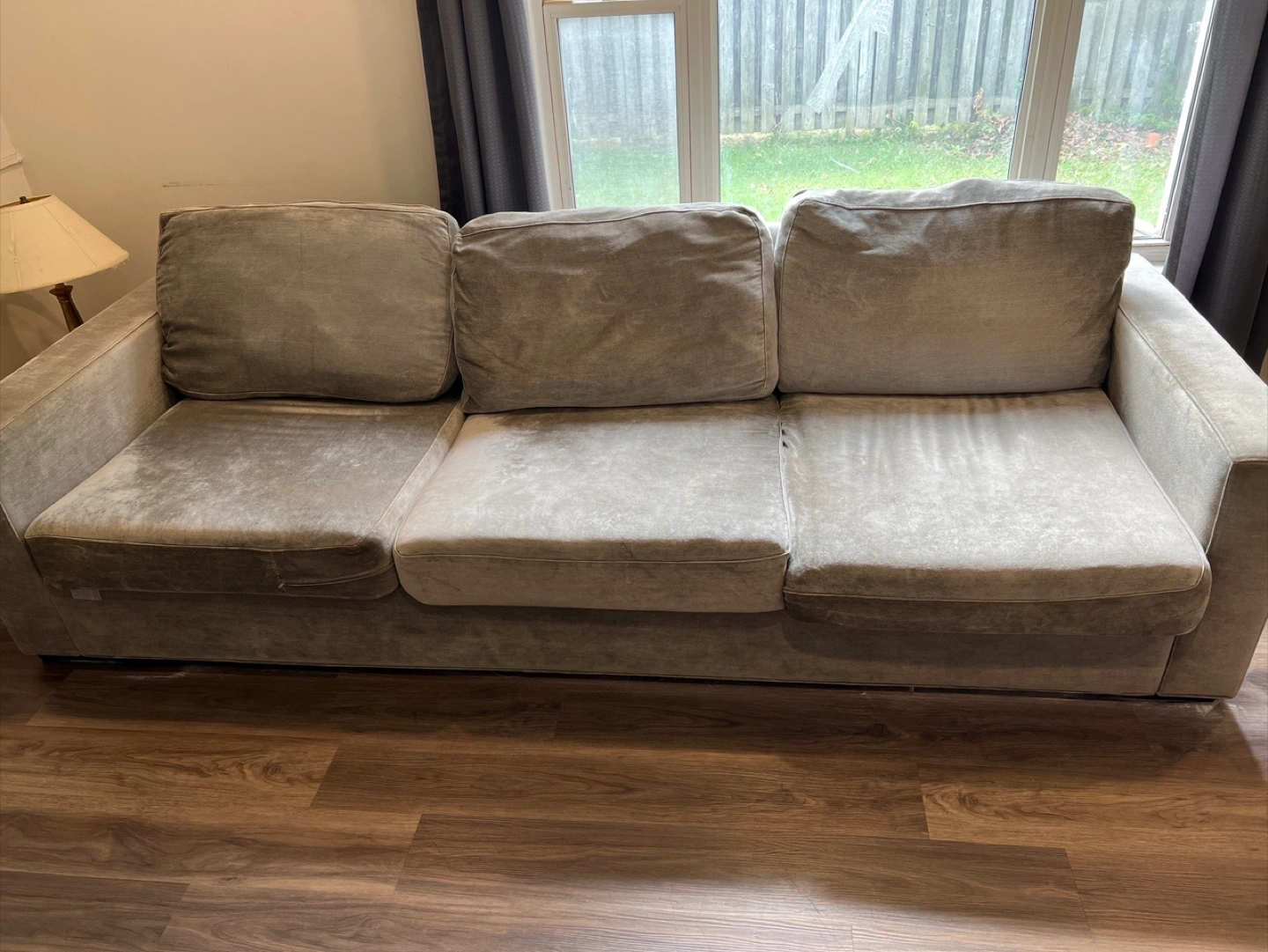 Selling a comfy grey four-seater sofa! It's perfect for a living room or den. This is a custom built sofa, very spacious. If you remove the cushions, it can be used as twin bed. Very sturdy and barely used.