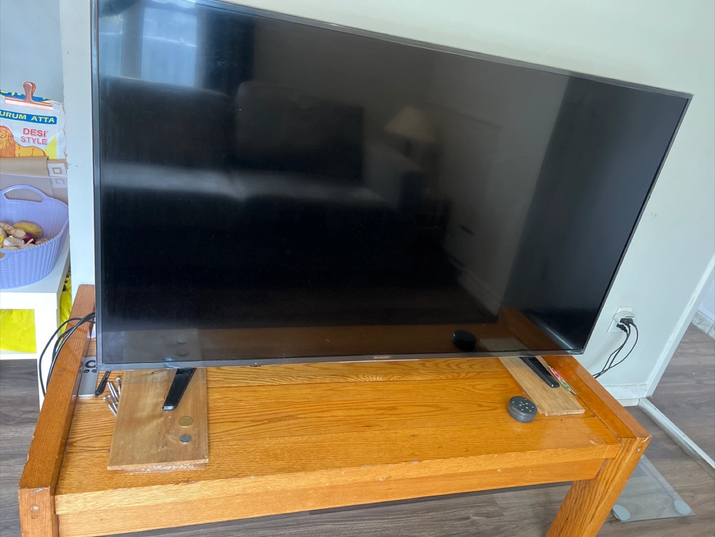 TV is barely used and still has protective plastic on the edges. Selling because moving out of the country. You can take the table shown in the photo with Tv.