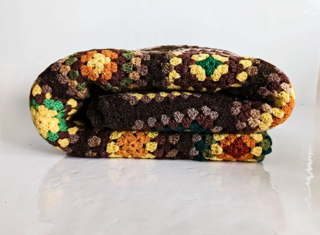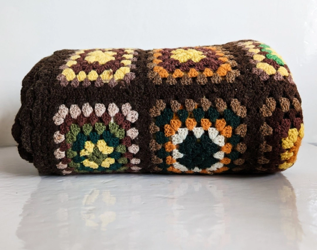 Groovy crocheted granny square blanket. Scalloped edges. Fits single bed. Various tones of brown, blue, rust, yellow, orange and green are used. Measures 60 inches in length x 44 inches in width. Good vintage condition, consistent with age. One square appears to have some unraveled threading. Excellent retro vibe.