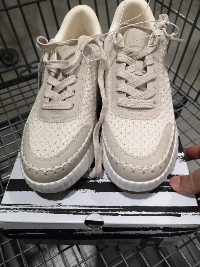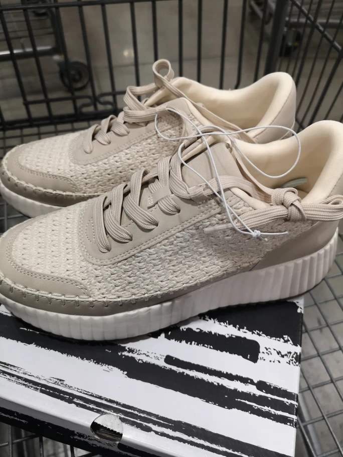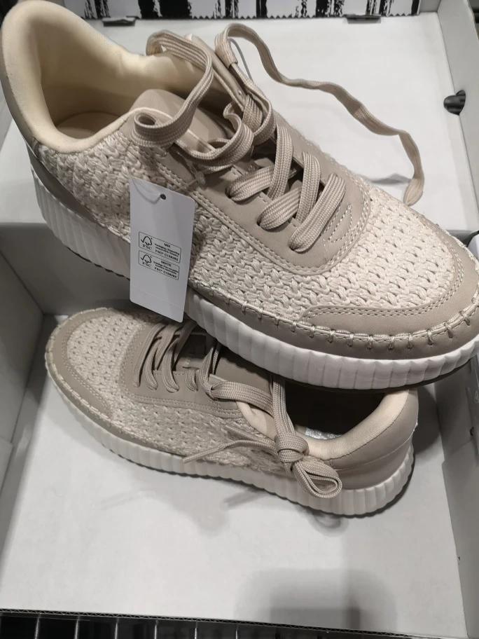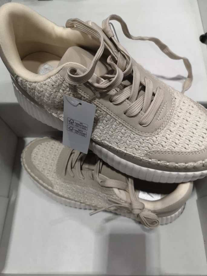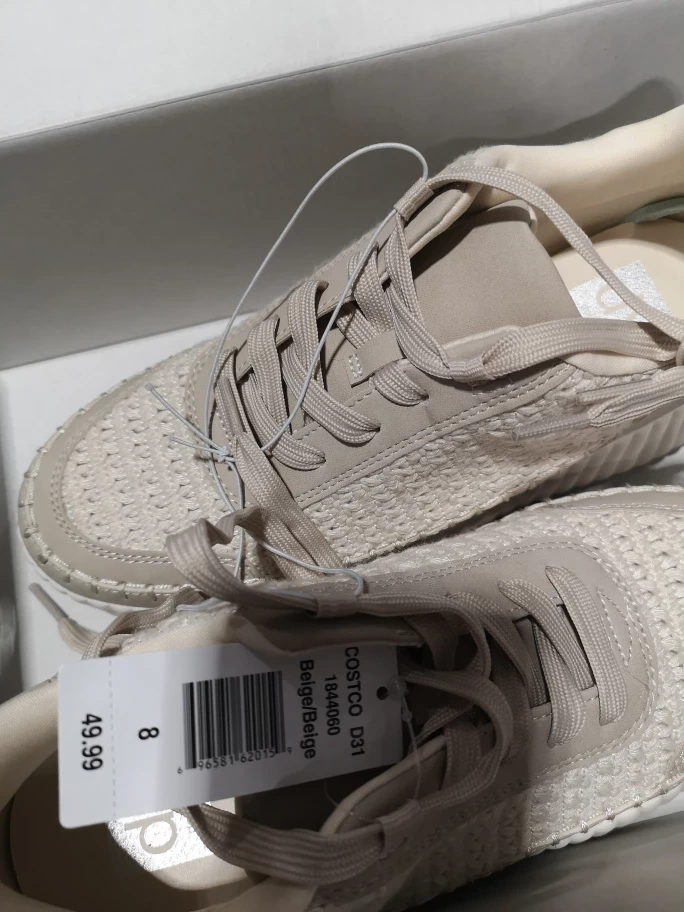 These beige/beige women's shoes are in new condition and come in their original box! They're a size 8 and were originally bought for $49.99. They have a stylish woven texture on the upper part of the shoe, perfect for adding a touch of casual elegance to your outfit