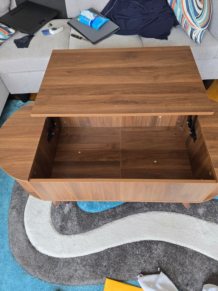 Selling a brown lift-top coffee table. It's in great condition and perfect for small spaces. The lift-top design provides extra storage and a convenient surface for working or eating. This table is both stylish and functional!