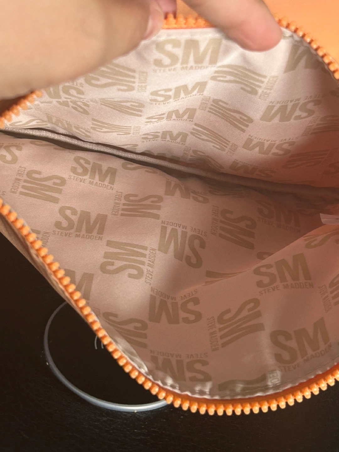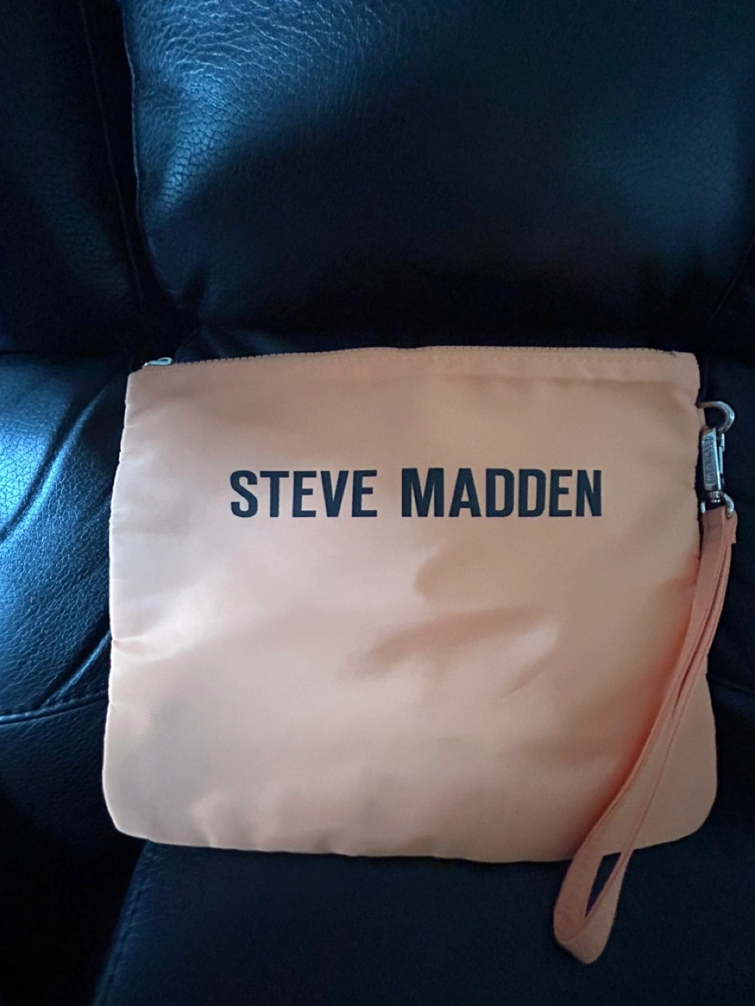 Selling a Steve Madden clutch bag in a lovely peach colour! It's in great condition and perfect for carrying your essentials. The interior has the Steve Madden logo printed all over. Comes with a wrist strap for easy carrying