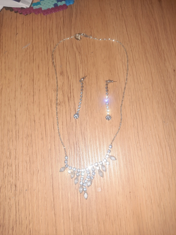 Necklace: The necklace features a silver-toned chain with a decorative pendant. The pendant has a central design with multiple clear or light blue stones and dangling elements.