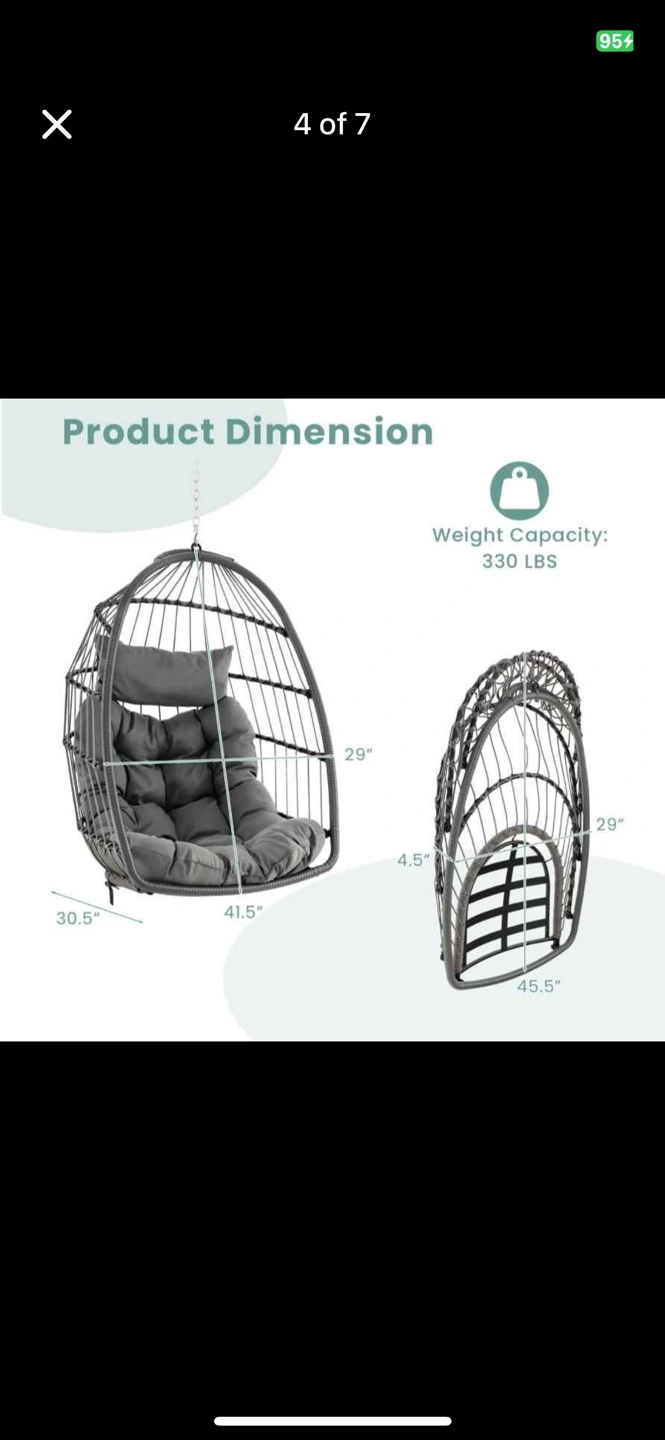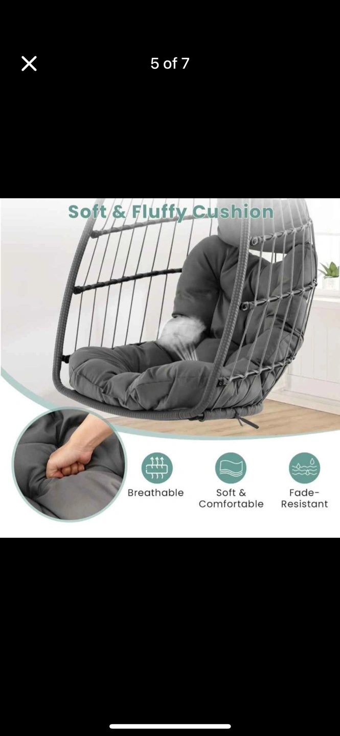 Selling a comfy grey egg hanging chair! It comes with a soft and fluffy cushion, perfect for relaxing. It's designed to be breathable, soft, and fade-resistant. The chair also features a foldable backrest, elegant tufted design, and comfortable headrest. The suspension hook is strong and the weight capacity is 330 lbs. Dimensions are approximately 30.5" x 41.5" x 29"