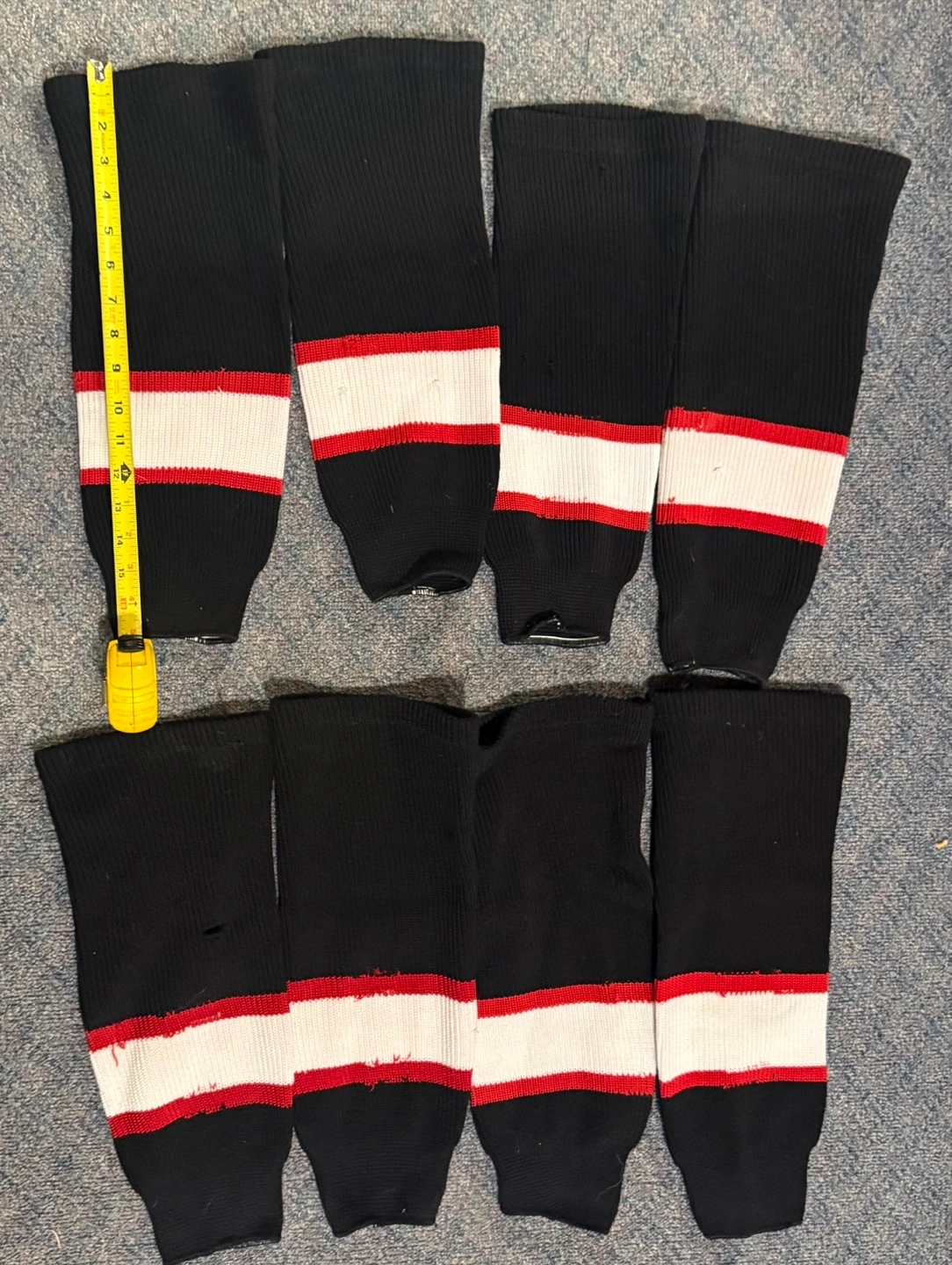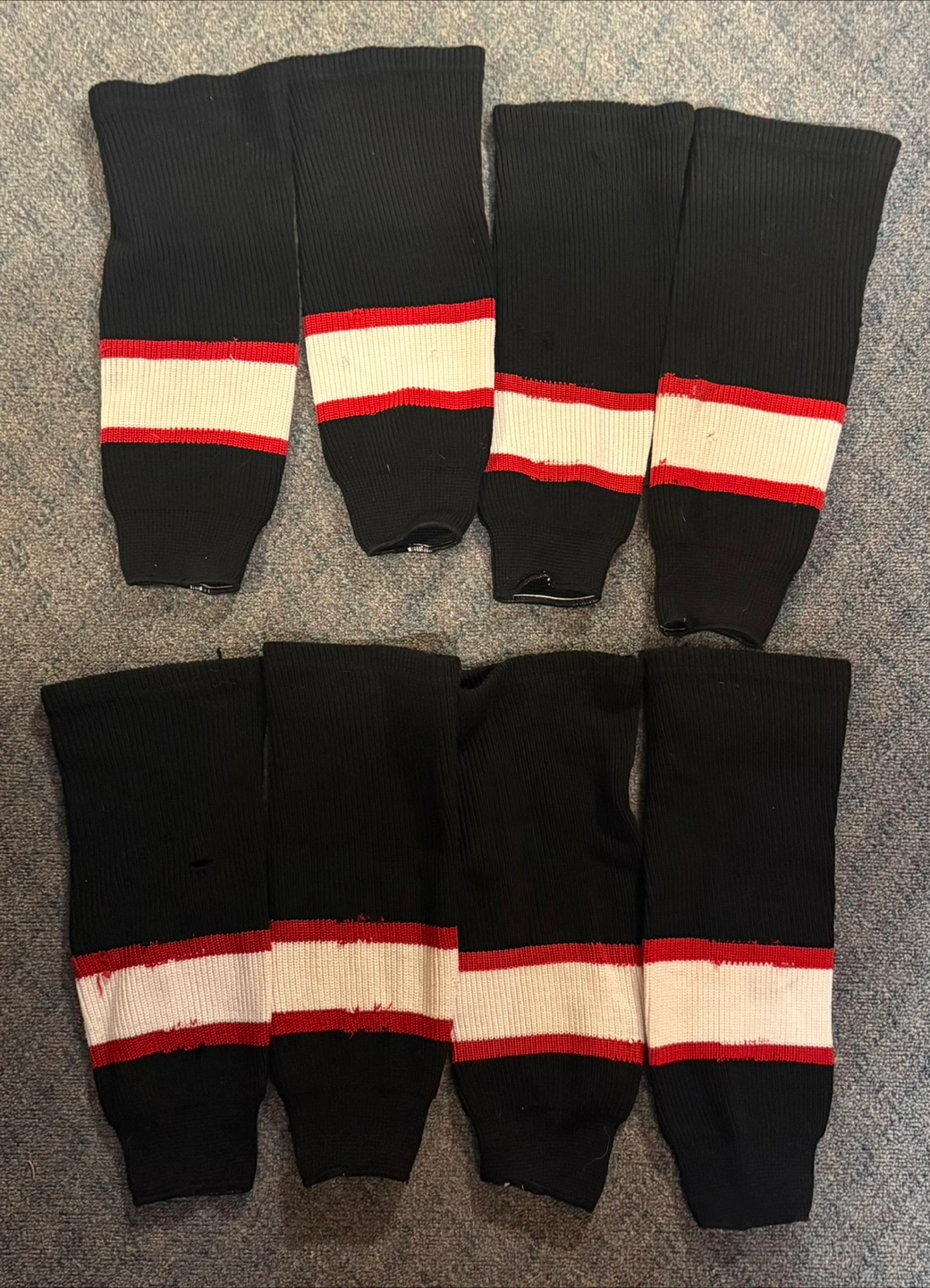 Selling hockey socks in black, white, and red. They're in good condition and ready for your next game! 4 pairs.