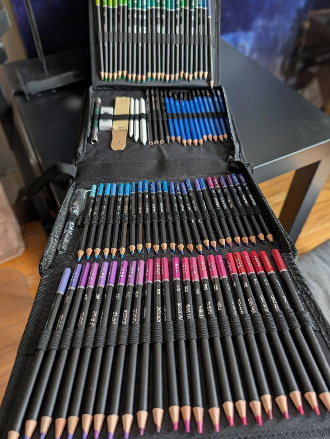 Selling a brand new H&B art kit, complete with 120 different coloured pencils (soft core, perfect for blending), 16 drawing pencils/charcoals, blending tools, fine marker, eraser, and sharpener!