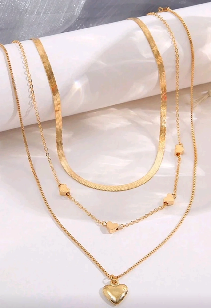 A layered necklace set with three different chain styles. It features a herringbone chain, a delicate chain with small heart charms, and a chain with a larger heart pendant. Gold tone finish.