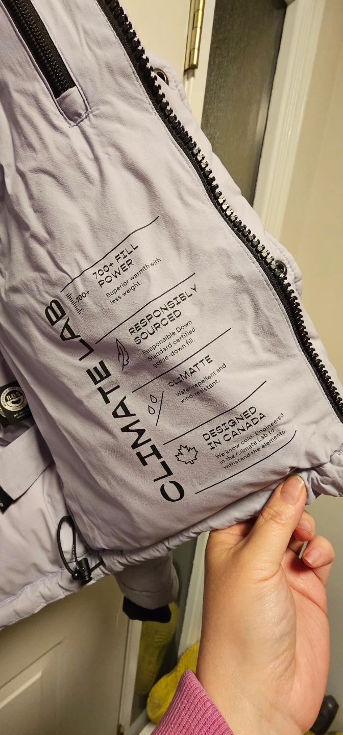 This is The Super Puff jacket in a light lilac colour. It's made with 700+ fill power down for superior warmth. The jacket is water-repellent and wind-resistant, designed in Canada for extreme climates. It's responsibly sourced and made in Vietnam.