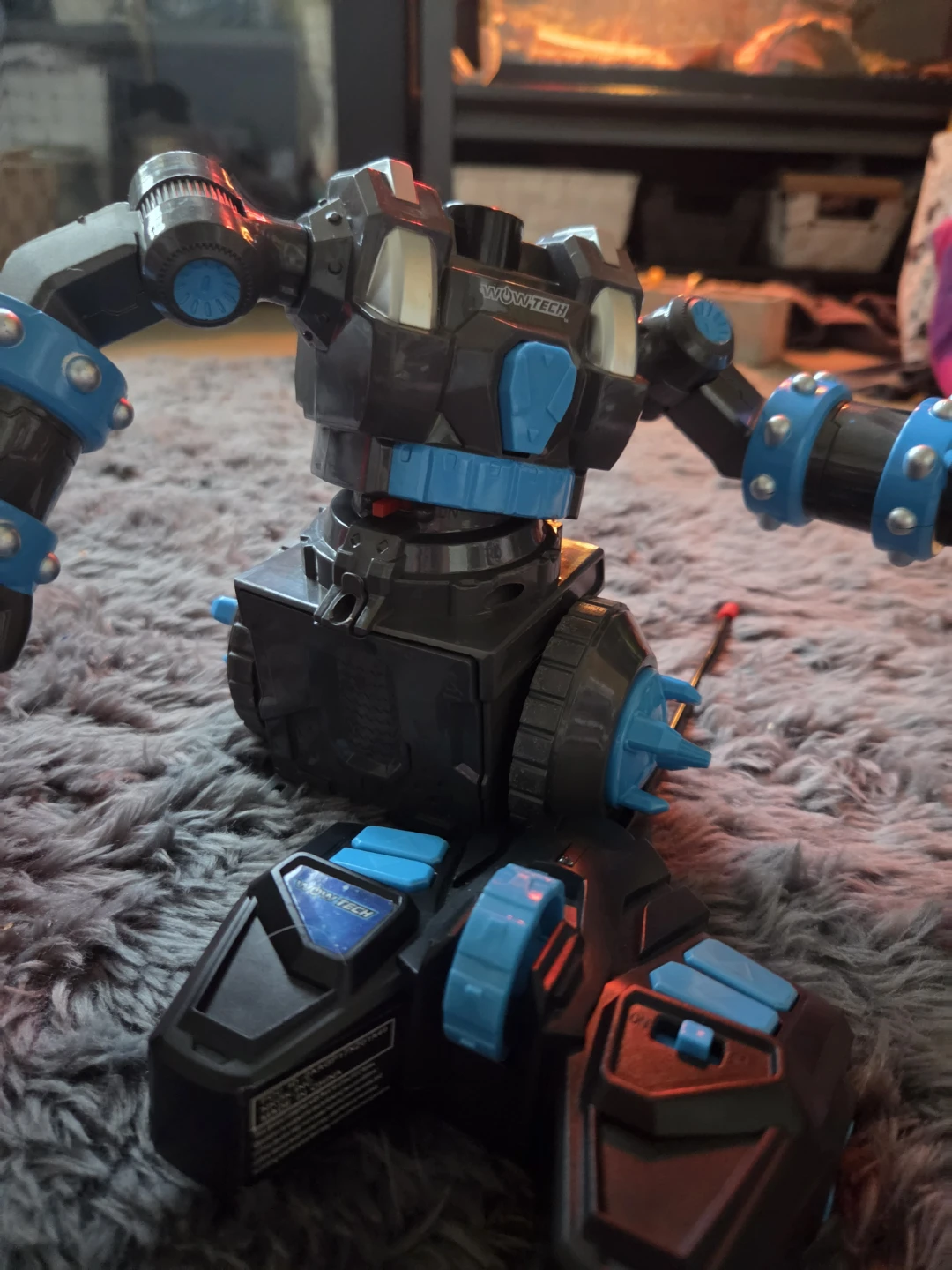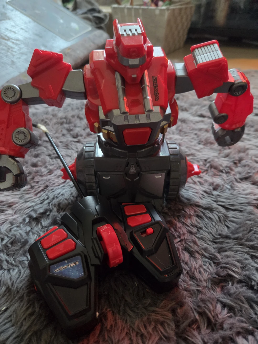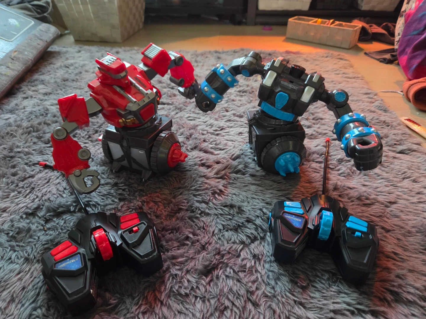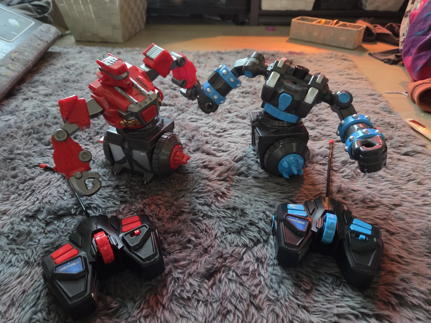 Set of two WOWW TECH remote control fighting robots, one red and one blue. Each robot comes with its own remote control. They're designed for interactive play.