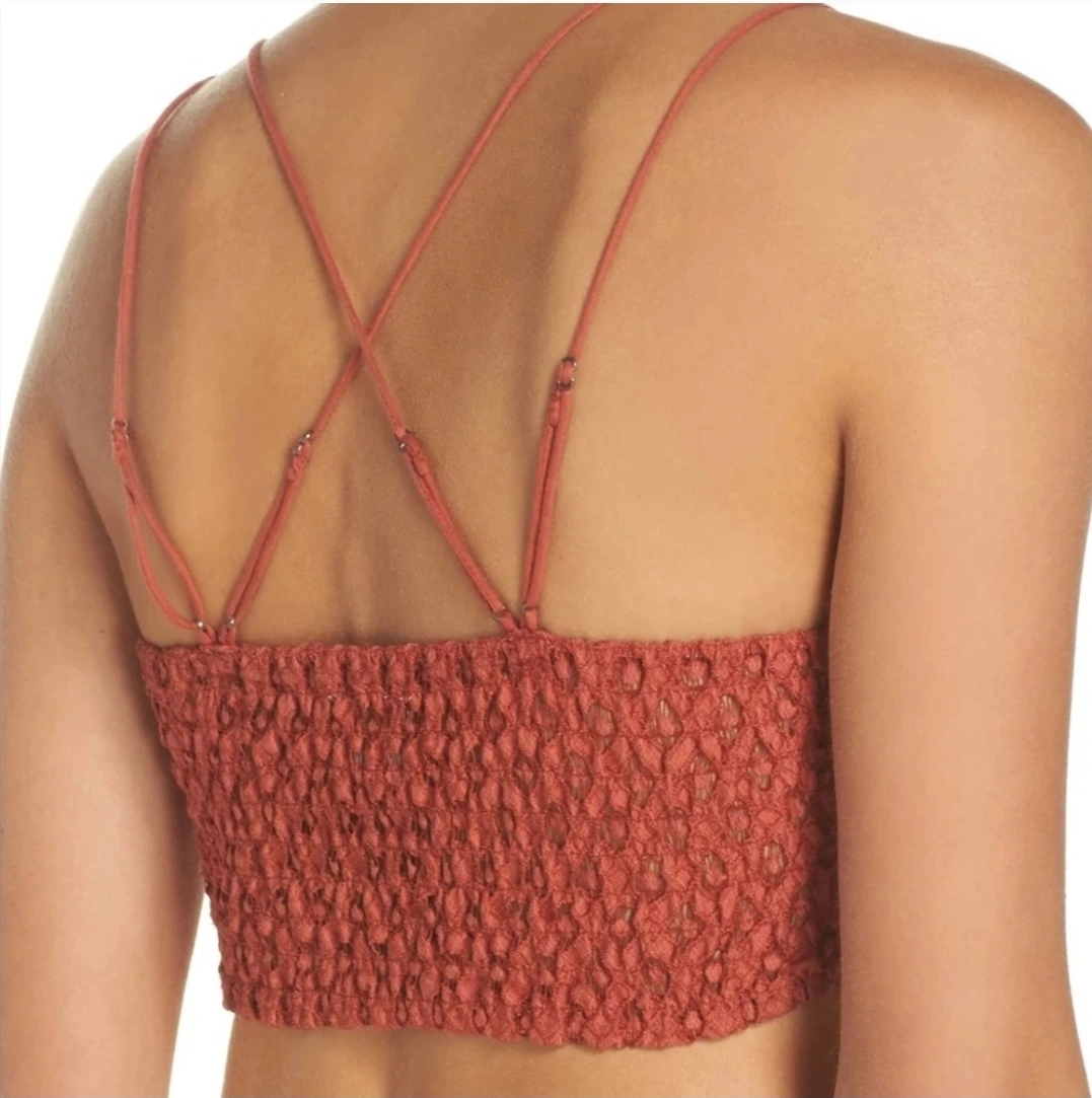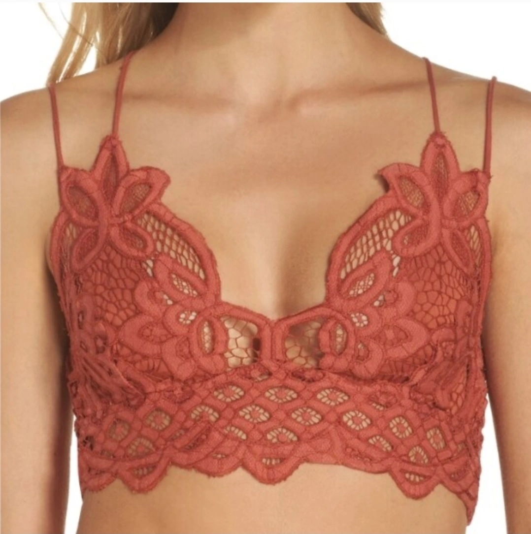 125Selling a Free People Adella Bralette in rust colour. It's a beautiful lace bralette with a unique floral design. The back features a criss-cross strap design. Perfect for layering or wearing on its own!