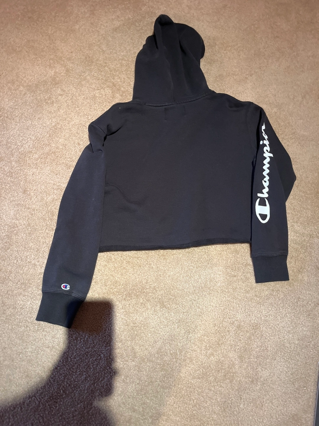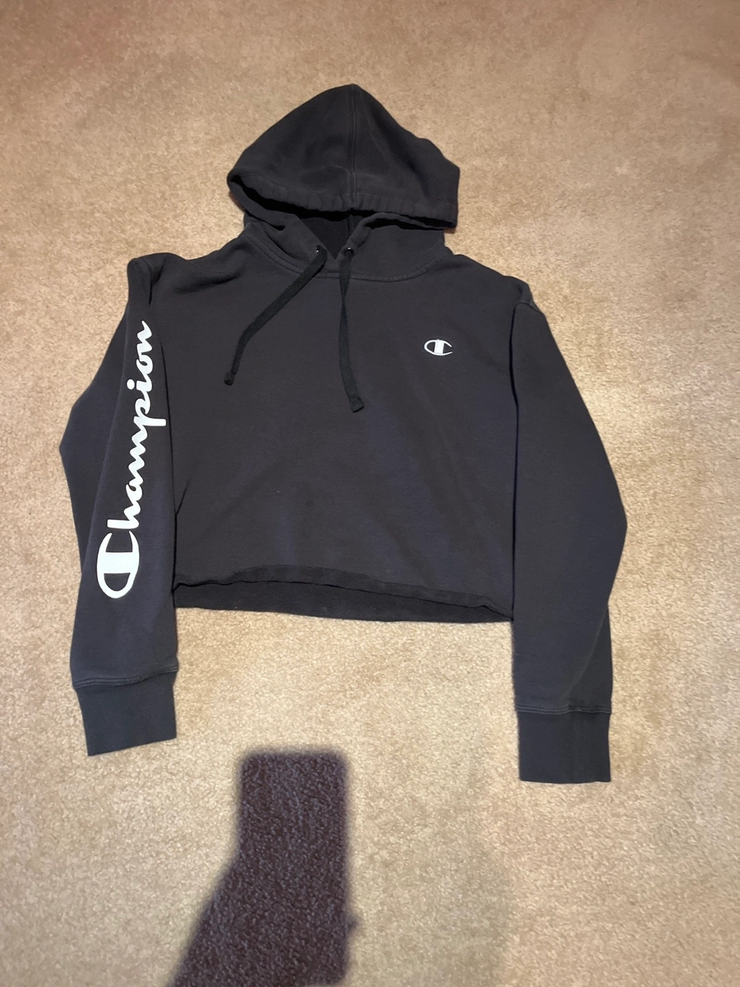 Selling a black cropped hoodie from Champion. It features the Champion logo on the sleeve and chest. Perfect for casual wear!