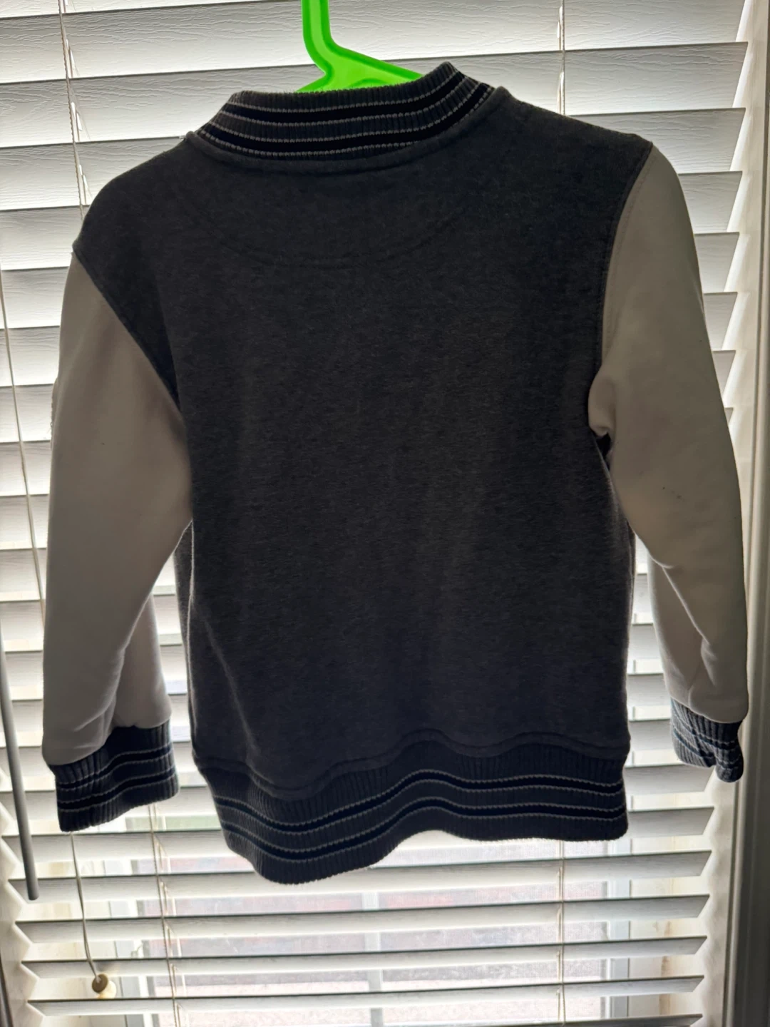 Selling a cute kids' varsity jacket in size 3T! It's grey with white sleeves and has a sporty design. Perfect for keeping your little one warm and stylish