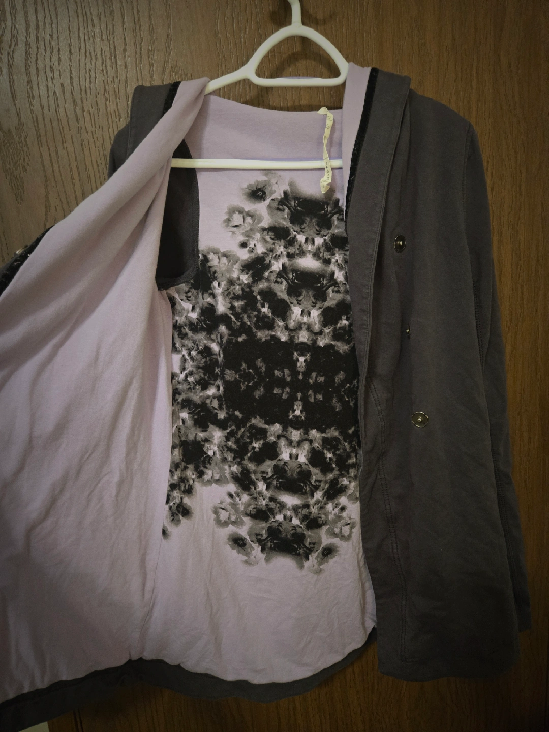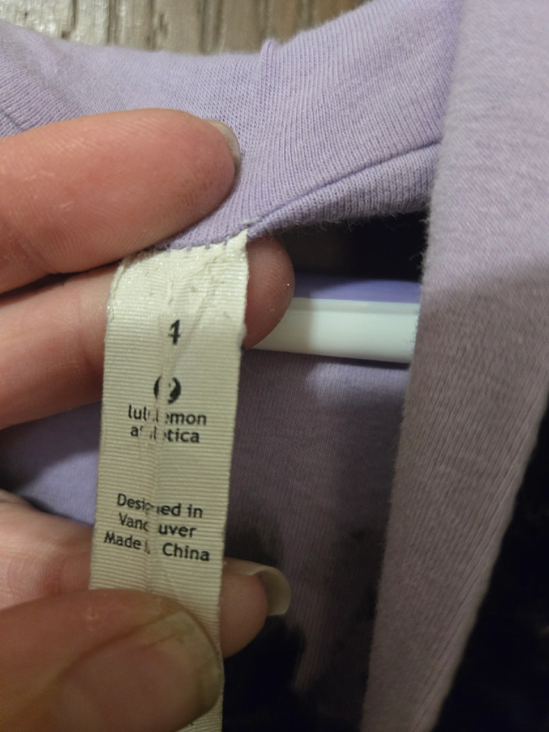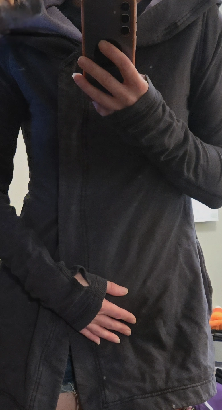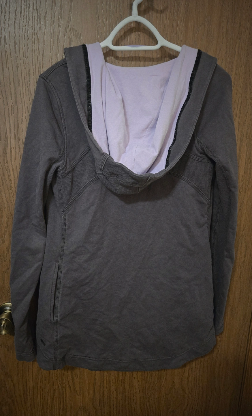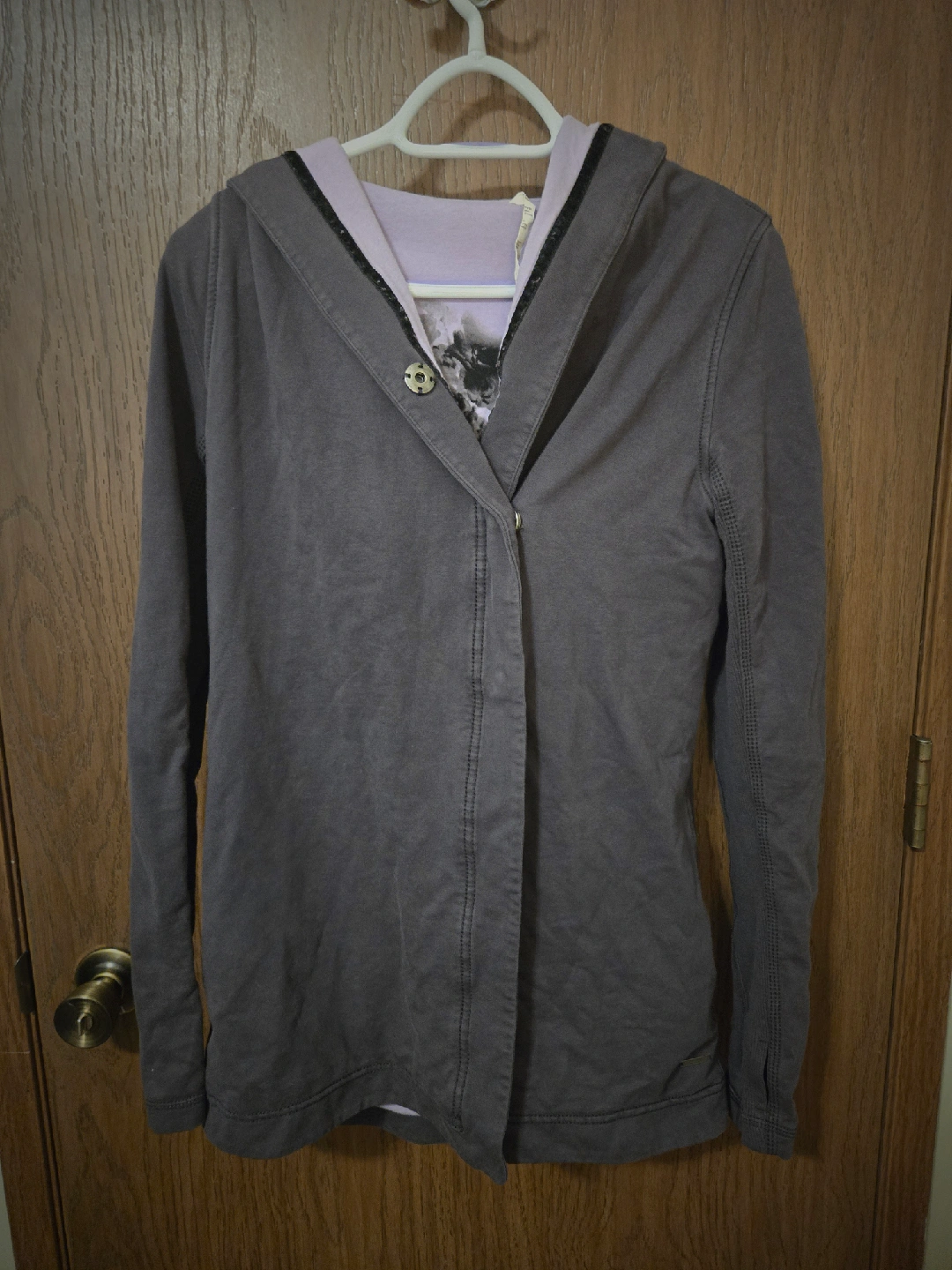 Selling a Lululemon Athletica jacket in size 4. It's a stylish jacket with a hood and a button closure. The jacket is grey on the outside with a lilac interior. It also has thumb holes! Great Condition.