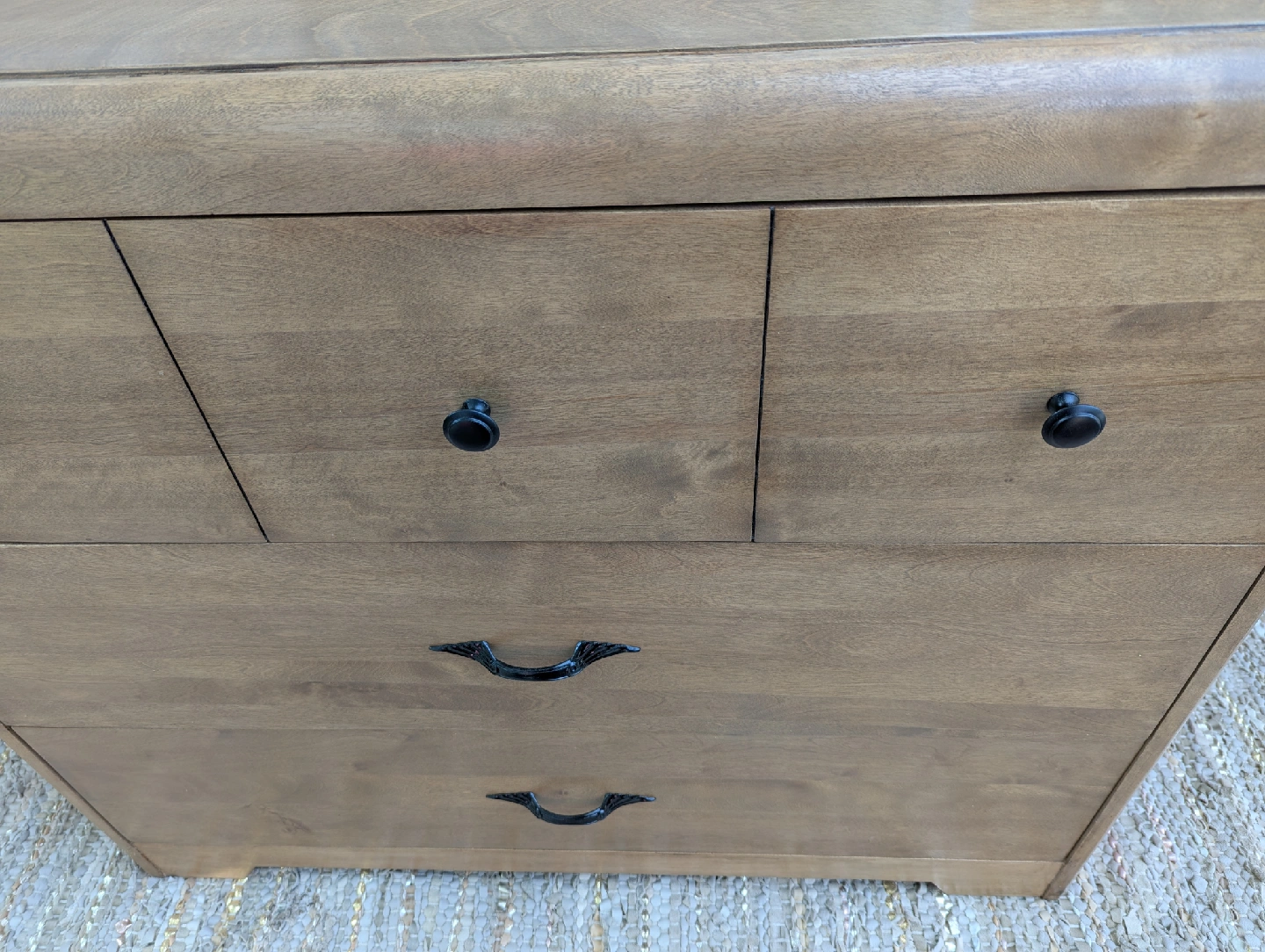 Three drawers boast plenty of storage. Each drawer is dove-tailed and slides well. Hardware has been refreshed.