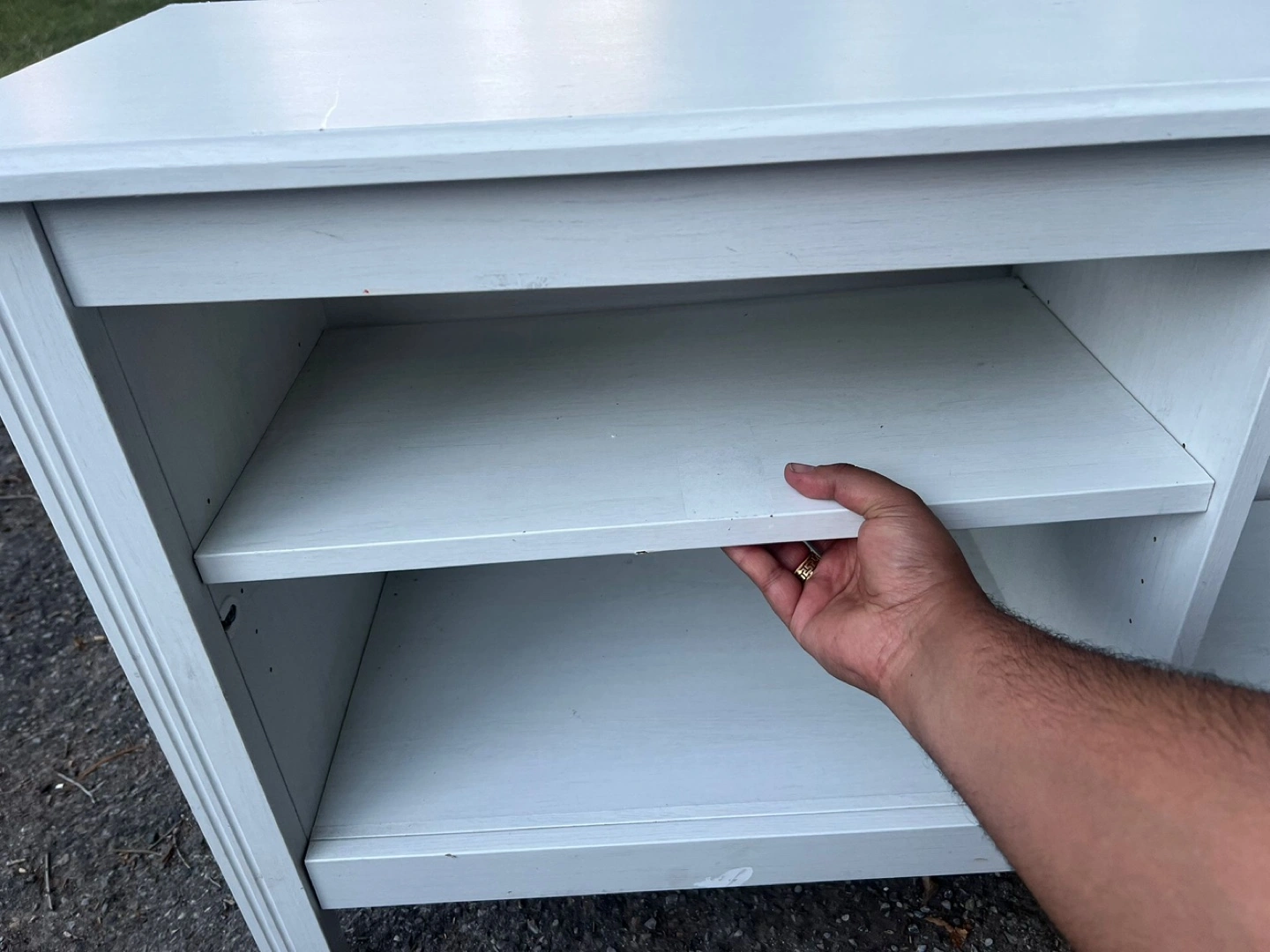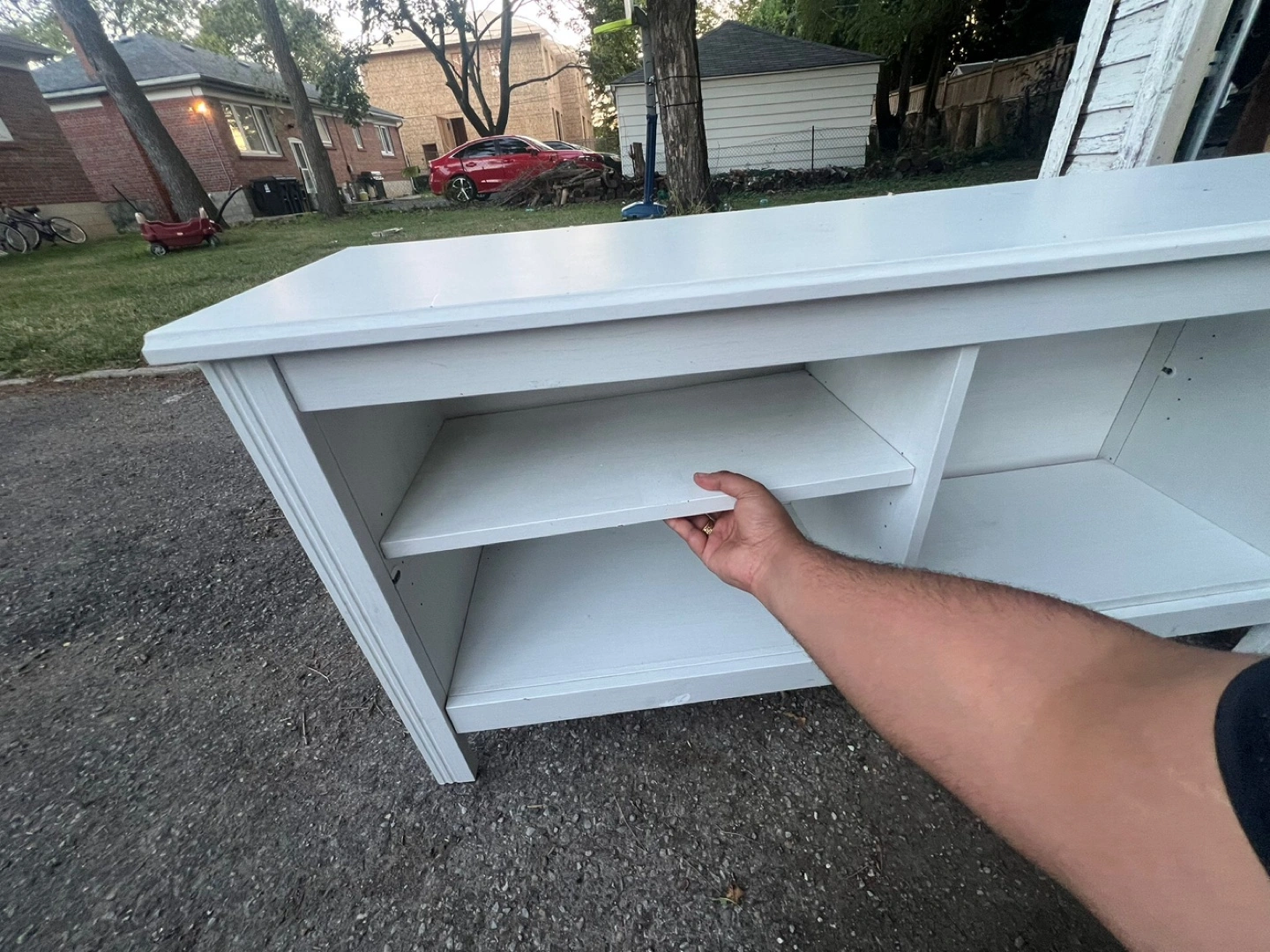 Selling a white wooden shelf unit. It's in good condition and would be great for storage or display. It has two shelves and a top surface. It's a sturdy piece of furniture.