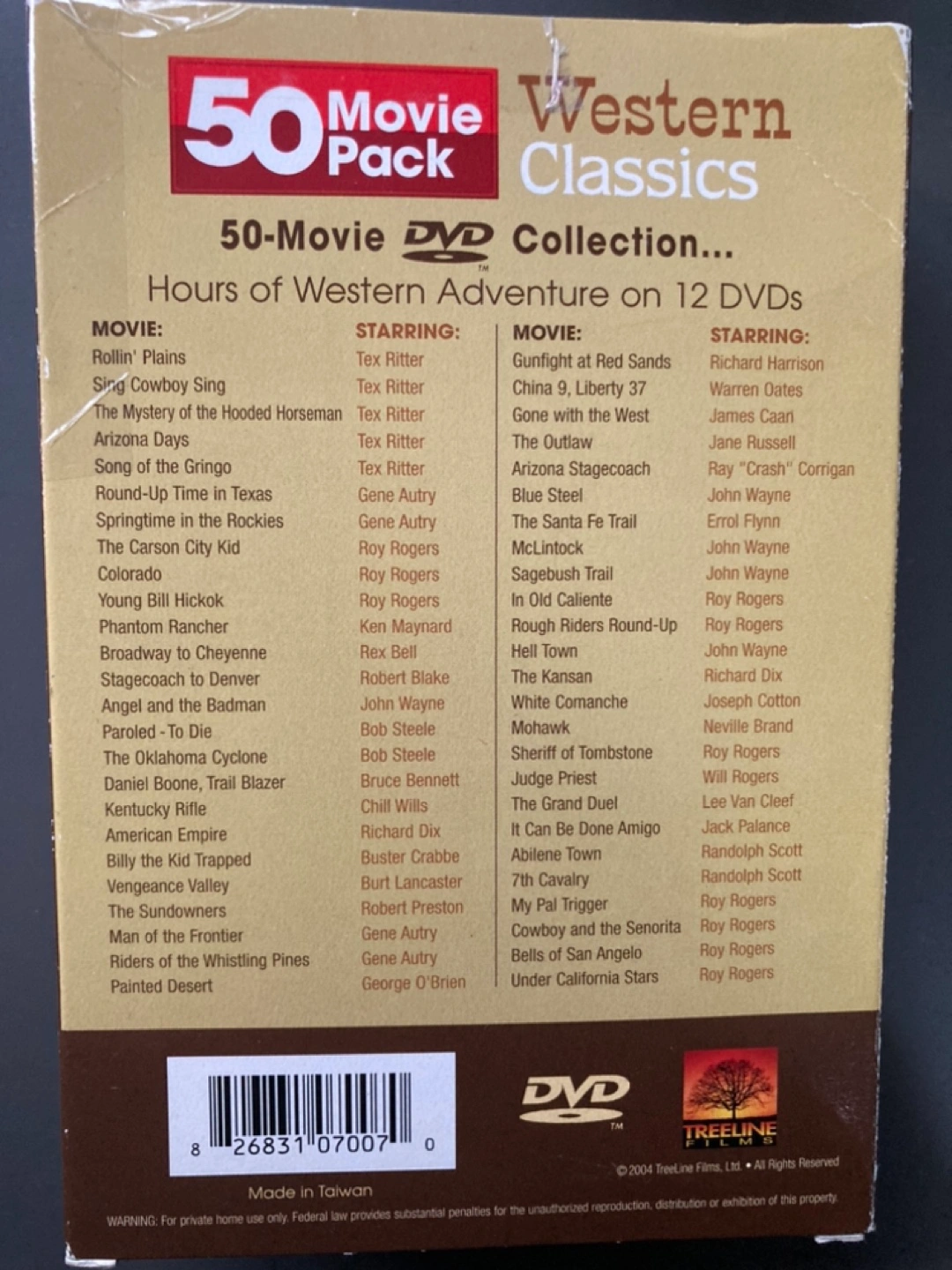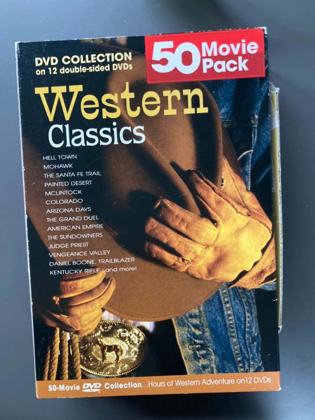 Dvd collection of 50 classic westerns. See Roy Rogers, Burt Lancaster, Will Rogers, and many more. Only 2 of the dvds have been played. Box has a tear at the side
