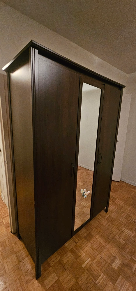 Selling a dark brown wardrobe with a mirror. It's in good condition and perfect for adding extra storage to any room. its from IKEA