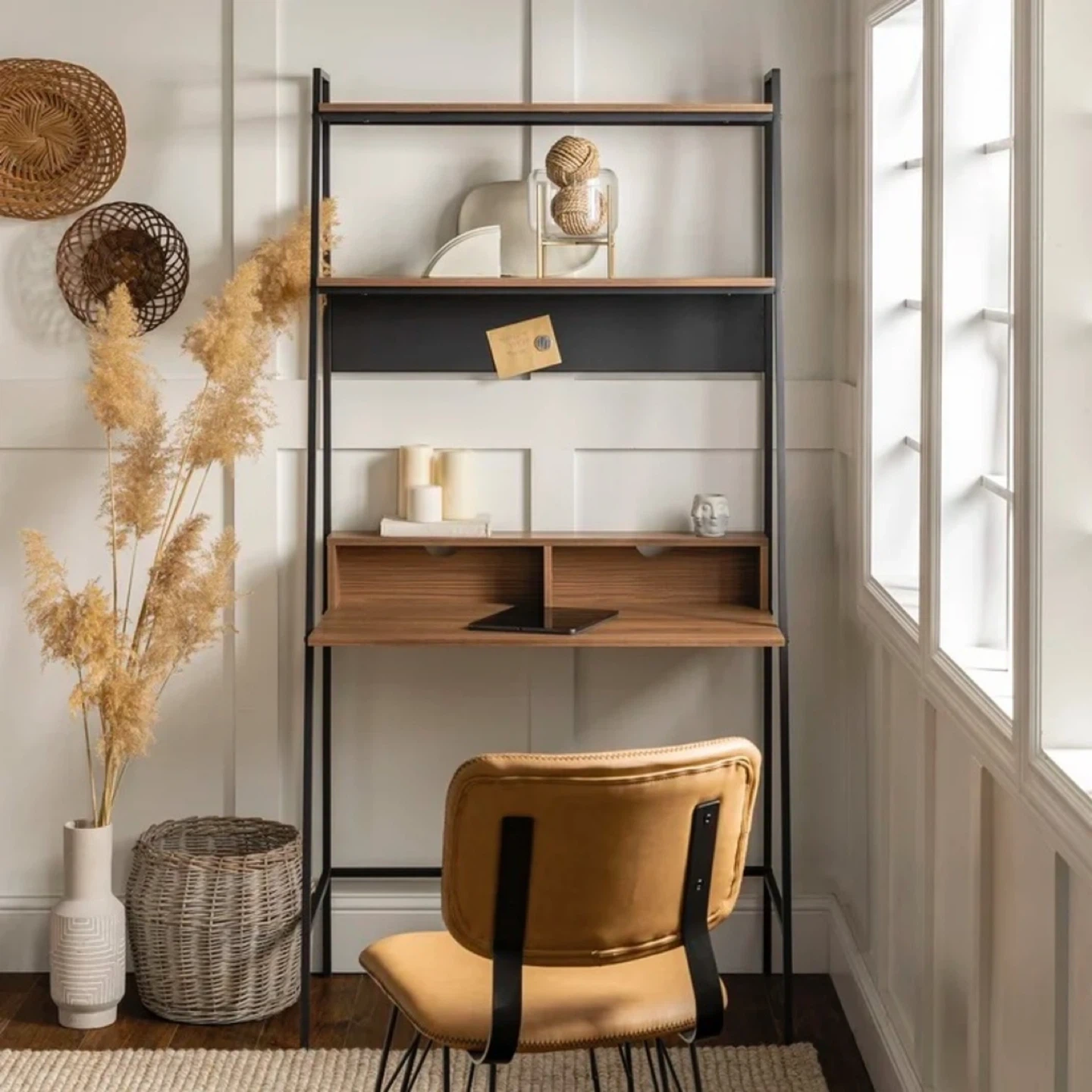 This leaning ladder desk features a tall frame with open sides and an open back. The center desk sports a drop-front panel for you to place your laptop, while two cubbies with cable-management cutouts are great for stowing e-devices and accessories. Rounding out the design, two upper shelves provide perfect platforms for displaying books, framed photos, and decor.