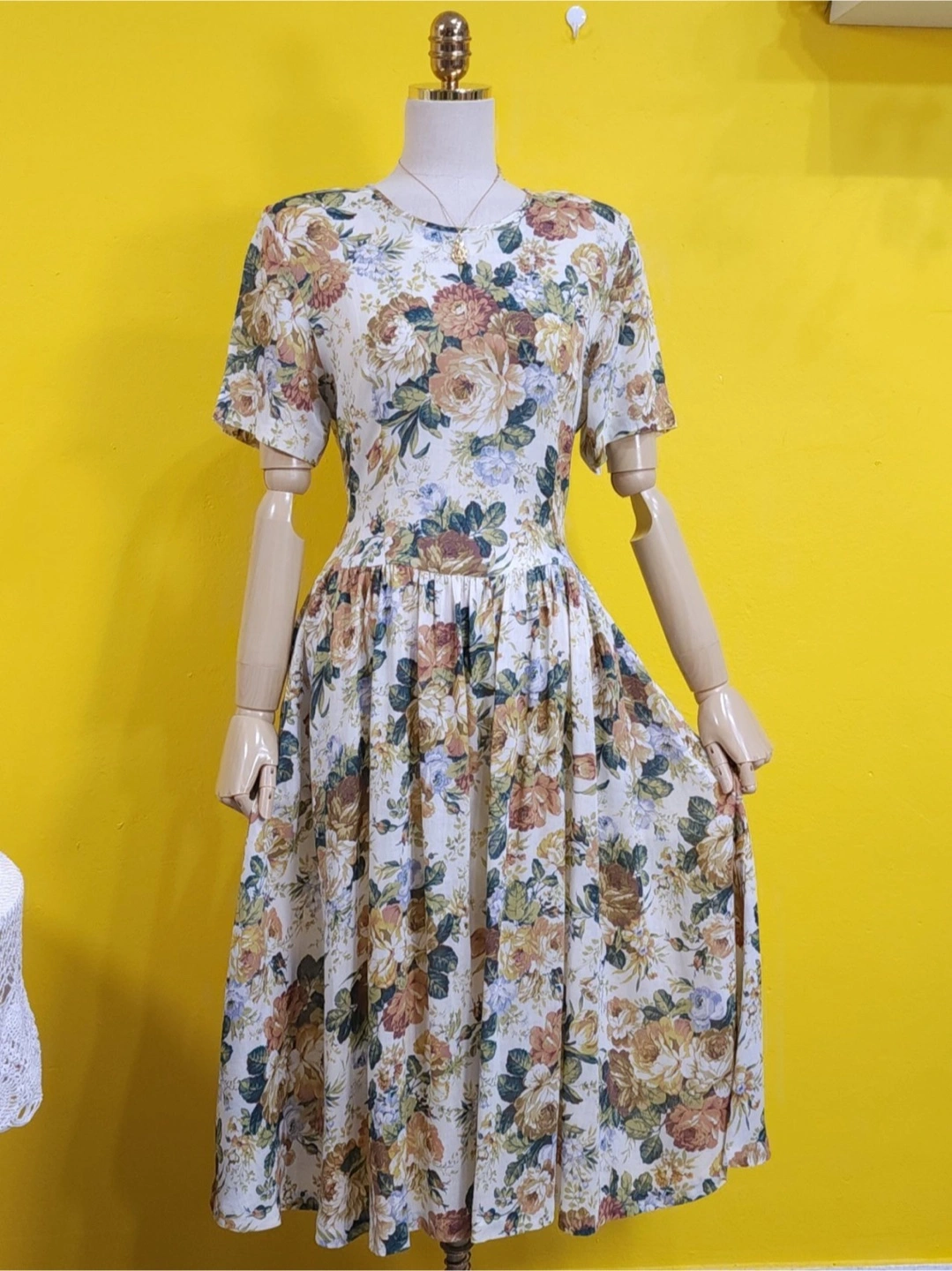 A beautiful vintage floral midi dress made from a soft and breathable rayon-linen blend. This dress features a fitted waist with flattering vertical darts at the front and back, creating an elegant silhouette. Designed with a back zipper closure, short sleeves, and practical side pockets, it offers both comfort and timeless charm.