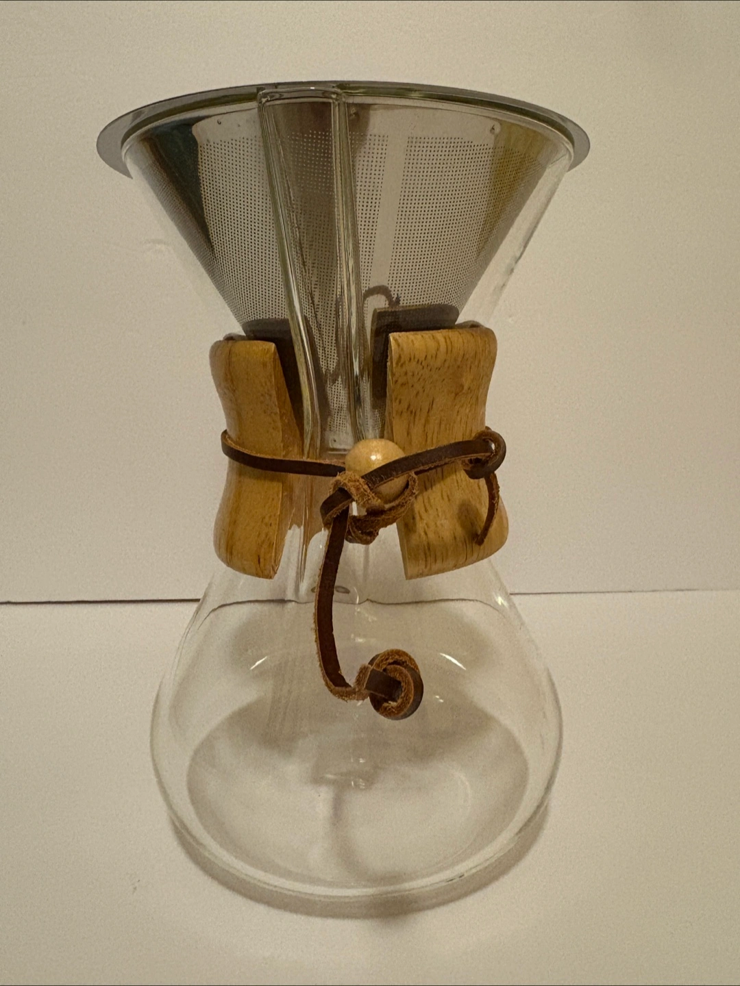 Holds 8 cups of liquid with a stainless steel filter to make the perfect cup of pour over coffee. Container is glass and easy to wash.