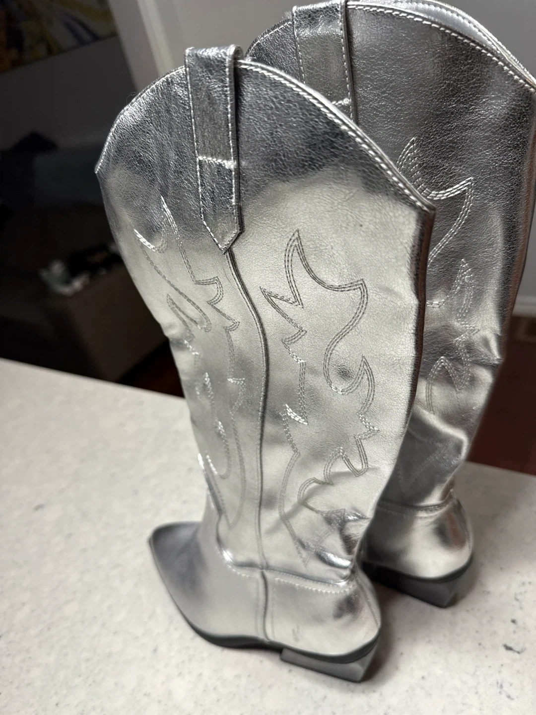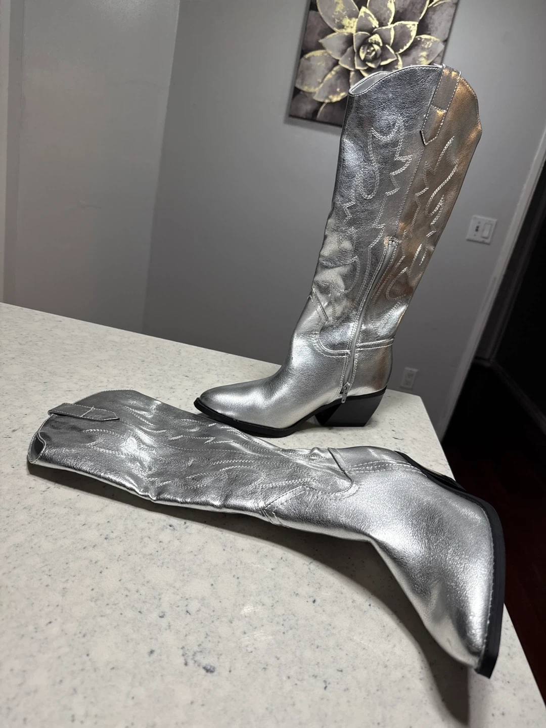 75Selling a pair of Madden NYC silver cowboy boots in a women's size 7. These boots are a fun and stylish statement piece! They are ready for a new home