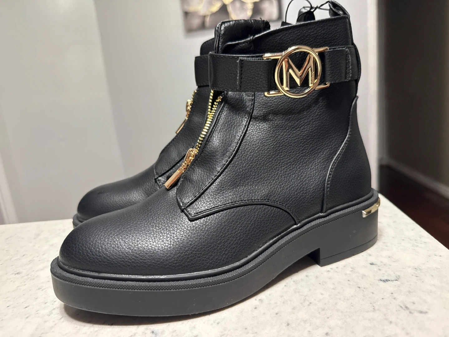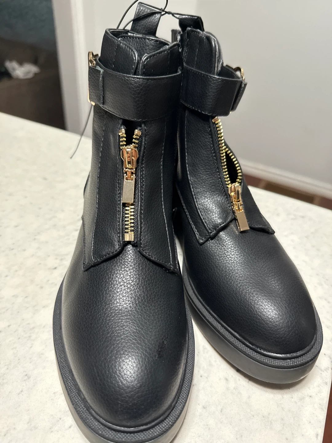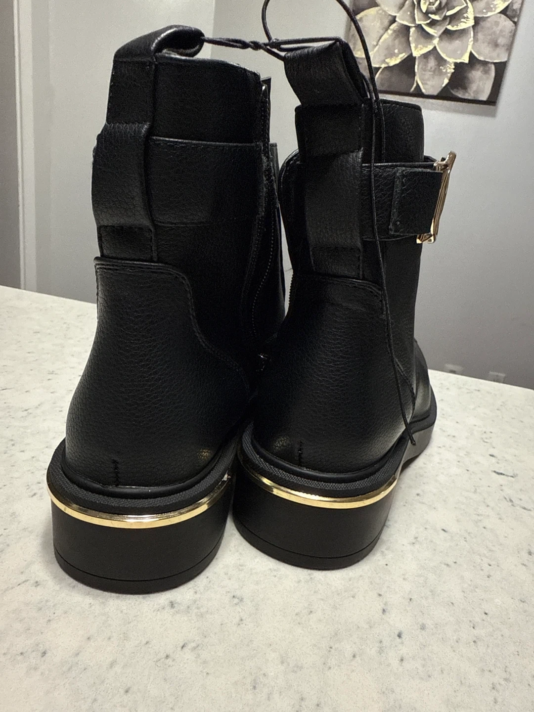 75Cute black ankle boots with gold detailing! They're a size 6 and have a zipper on the front. Perfect for fall!