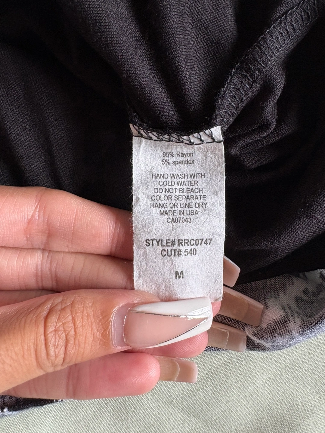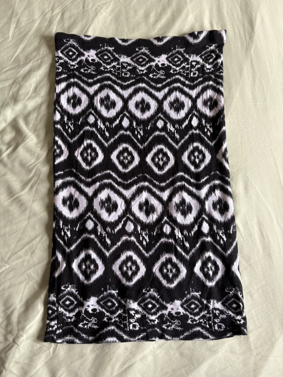 This skirt features a stylish black and white pattern! It's made from 95% rayon and 5% spandex, making it super comfy. Size is medium.