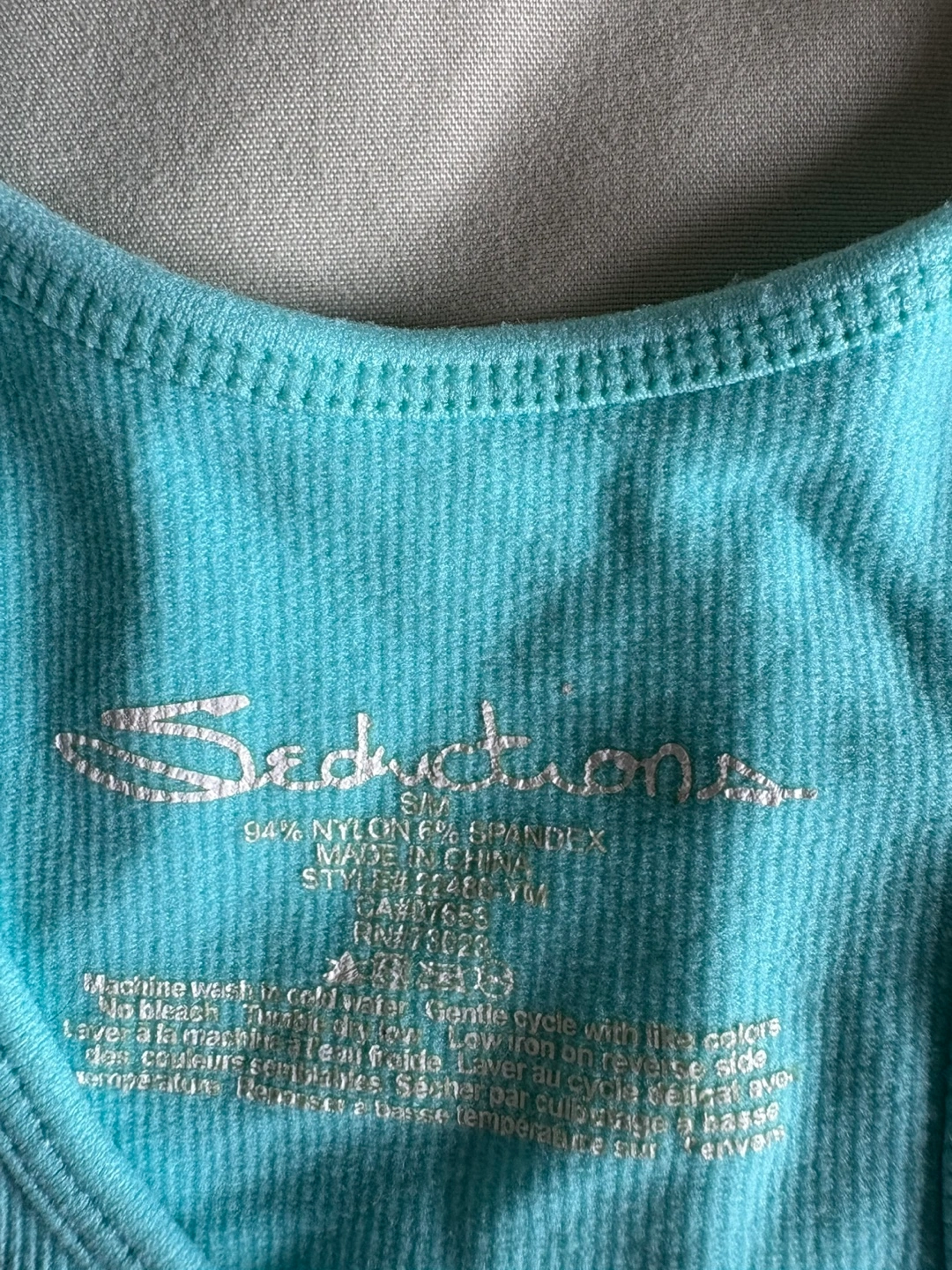 This Seduction tank top is a light blue colour and is a size S/M. It's made of 94% nylon and 6% spandex. It's in great condition! Payment: Cash only Location: Rossland and Church or Durham College Oshawa