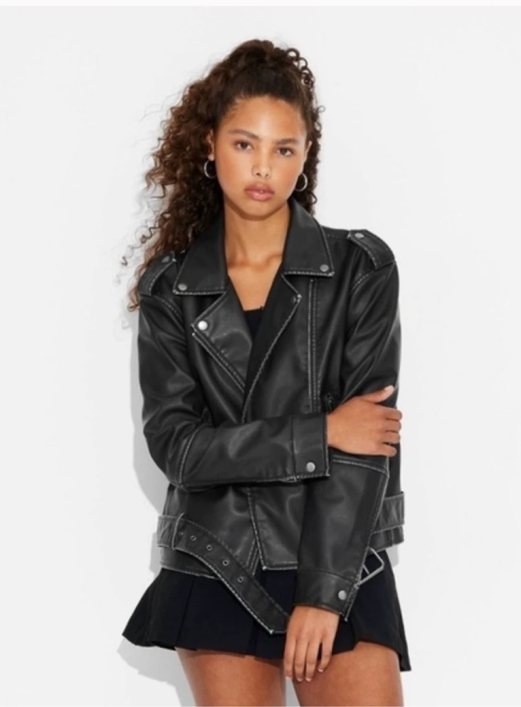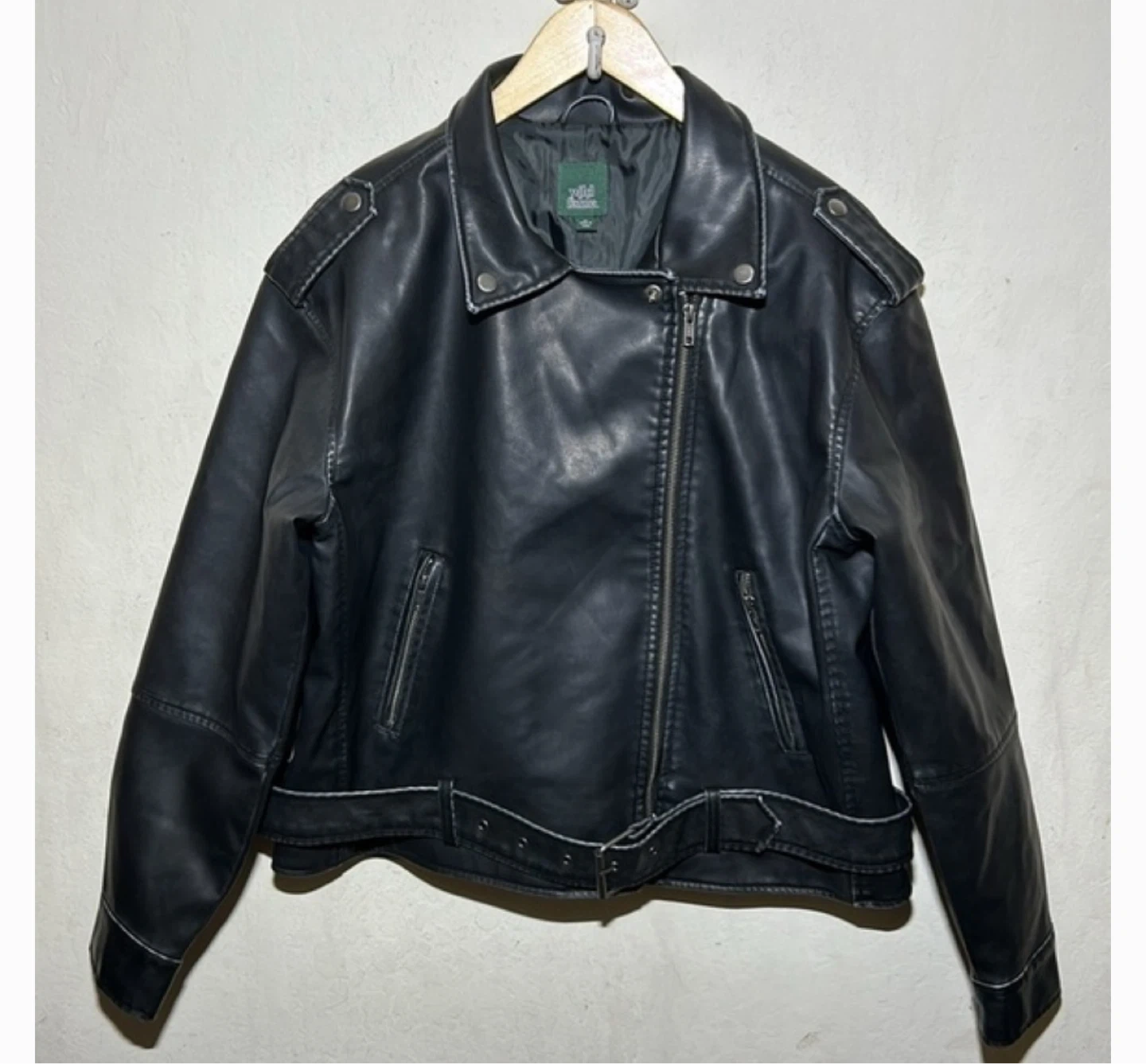 Selling a Wild Fable black faux leather moto jacket! Size M in women . It's a stylish piece that can be dressed up or down. This jacket features a classic moto design with an asymmetrical zip closure and a belted waist. The faux leather material gives it a sleek and edgy look. Worn Twice .