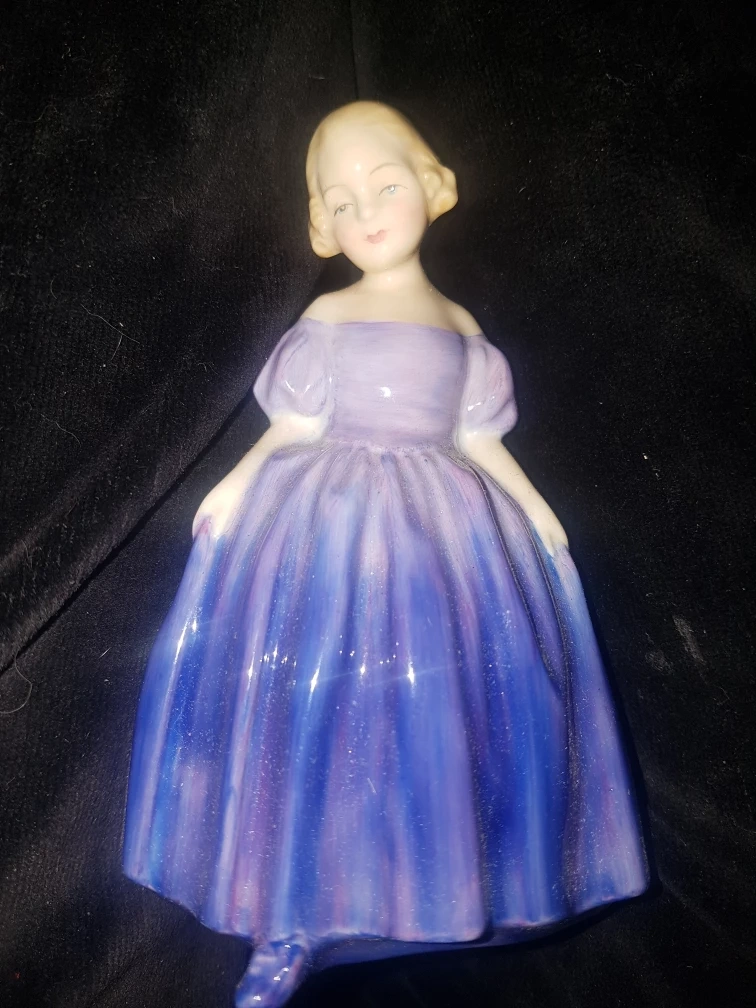 Selling a Royal Doulton figurine named Marie. It's marked with HN1370. This lovely piece features a woman in a blue and lavender dress. A beautiful addition to any collection