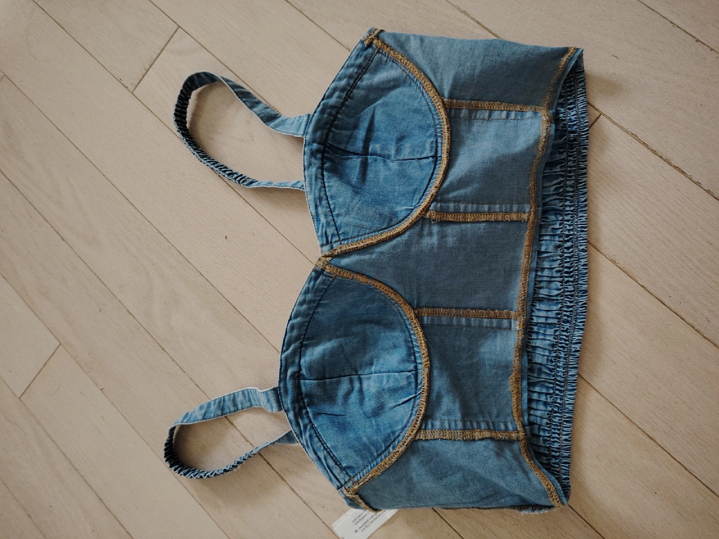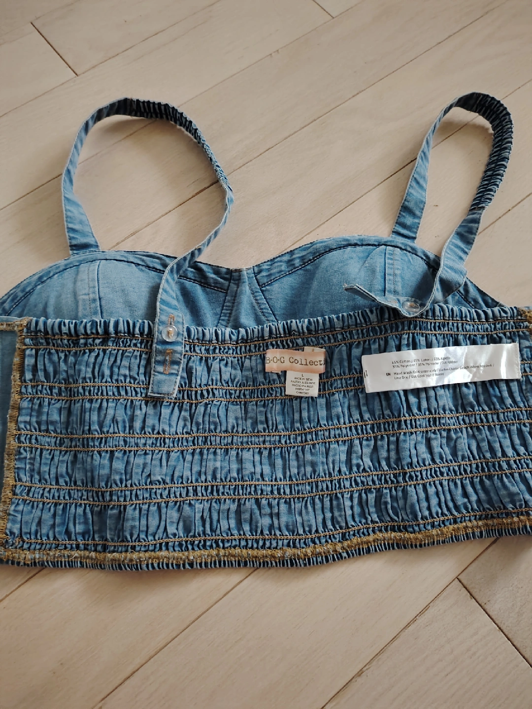 This is a cute denim bustier from B.O.G Collect in size L. It has a smocked back and adjustable straps. The material is 65% cotton and 35% polyester. It's perfect for layering or wearing on its own! wore once.