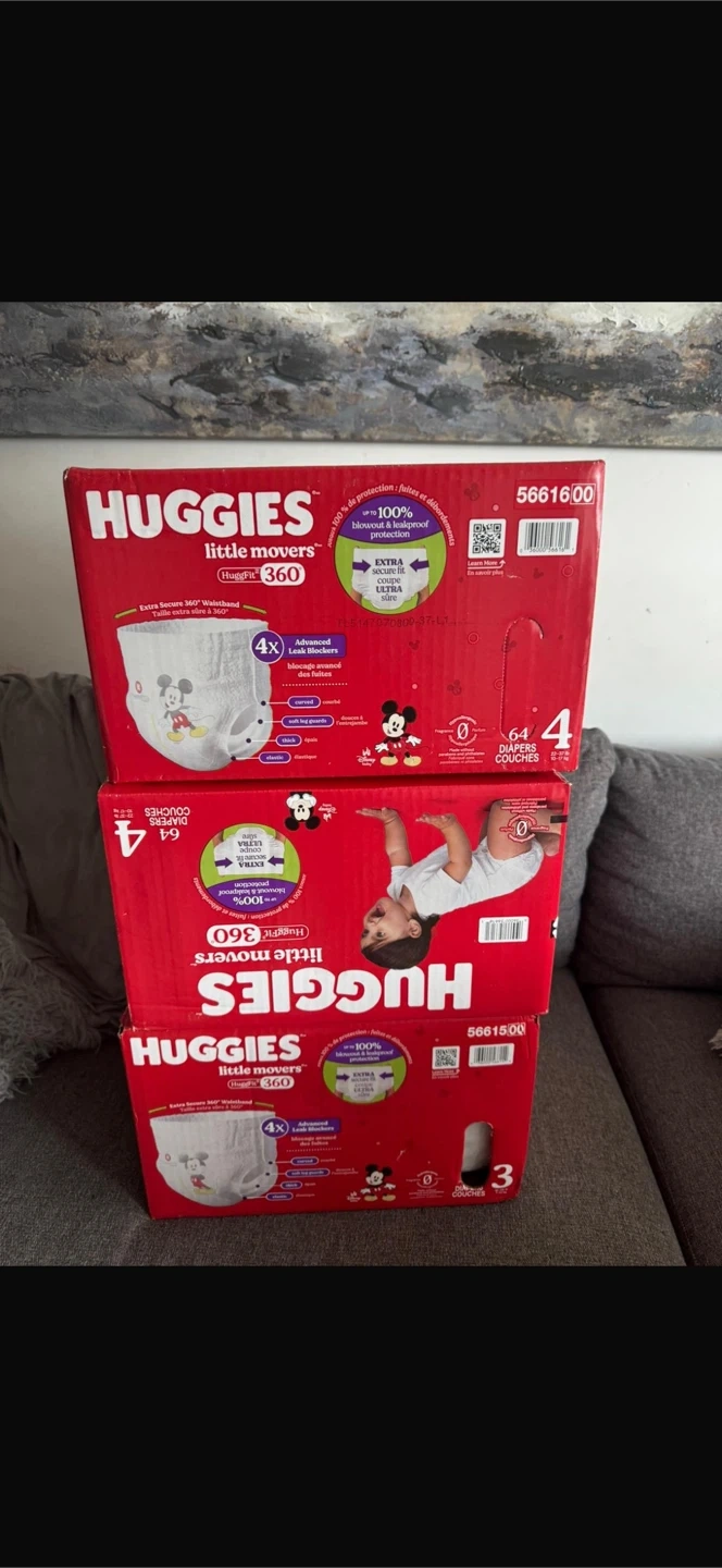 Selling a box of Huggies Little Movers diapers in size 0. There are 64 diapers in the box. These diapers have HuggFit 360 for extra secure protection against leaks and blowouts. They also feature advanced leak blockers for added security!