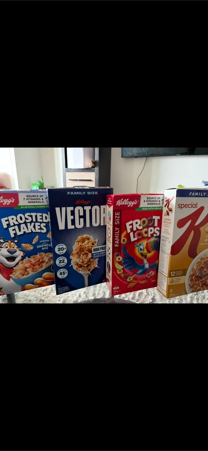 Selling a variety pack of Kellogg's cereals in family size boxes! Includes Frosted Flakes with Frosted Crunch Bite, Vector High Protein, Froot Loops, and Special K Vanilla Almond. Perfect for stocking up the pantry or trying different flavours