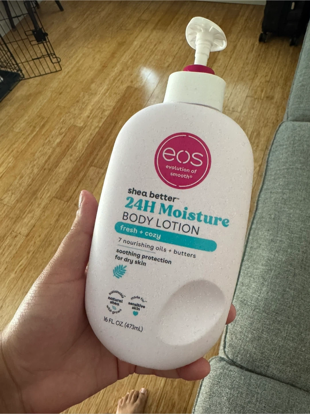 532Giving a bottle of EOS Shea Better 24H Moisture Body Lotion! It's the fresh + cozy scent, perfect for dry skin. Contains 7 nourishing oils and butters for soothing protection. It's a 16 fl oz (473mL) bottle.