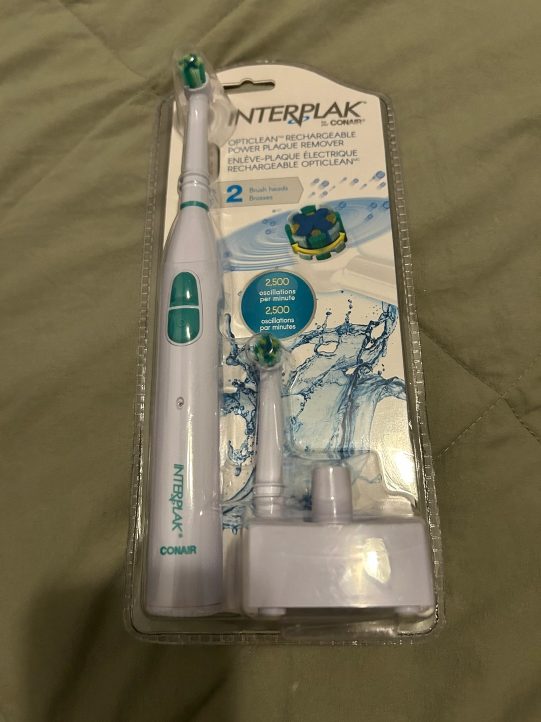 Selling a brand new Interplak Opticlean rechargeable power plaque remover toothbrush. It comes with 2 brush heads and a charging base. Never been used and still in its original packaging!
