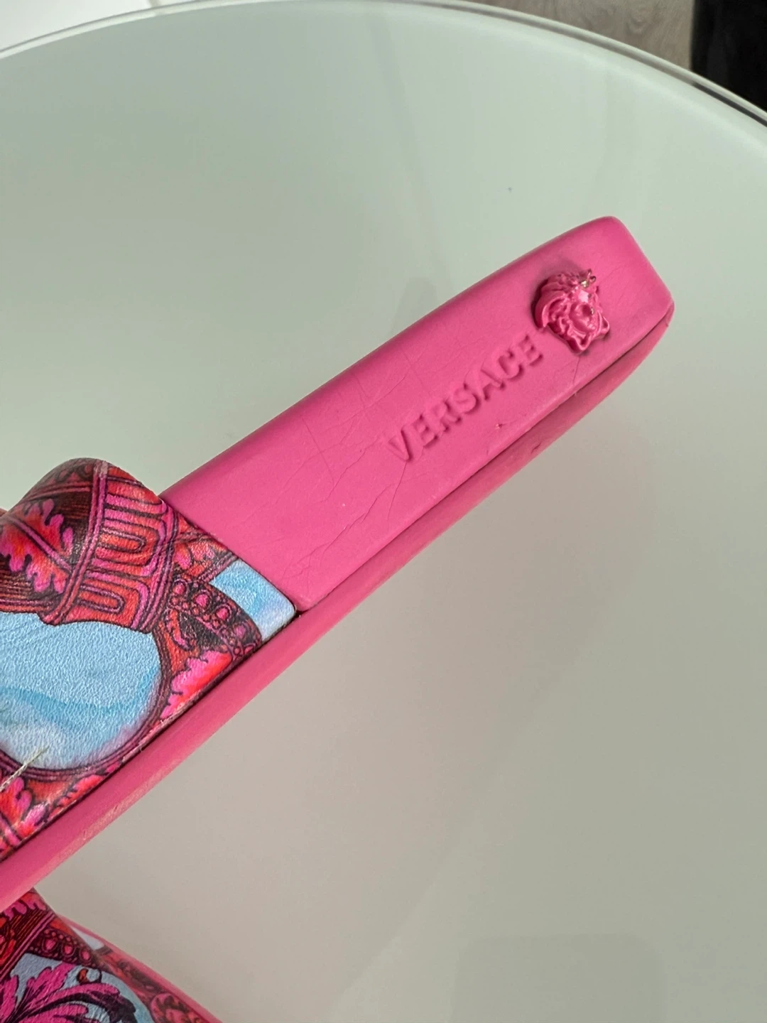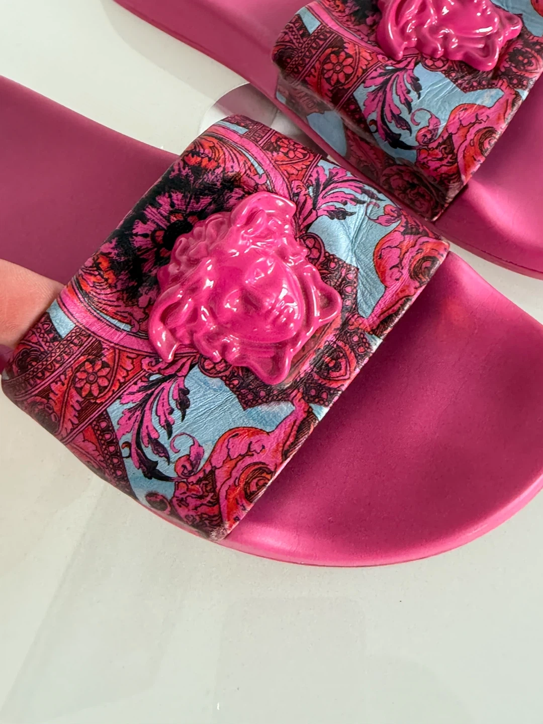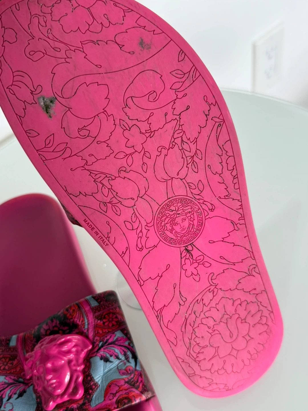 Versace Pink Baroque Leather Medusa Head Printed Slides Size: US 7 (37) Women Good condition 8/10 Location pick up Islington and Bloor