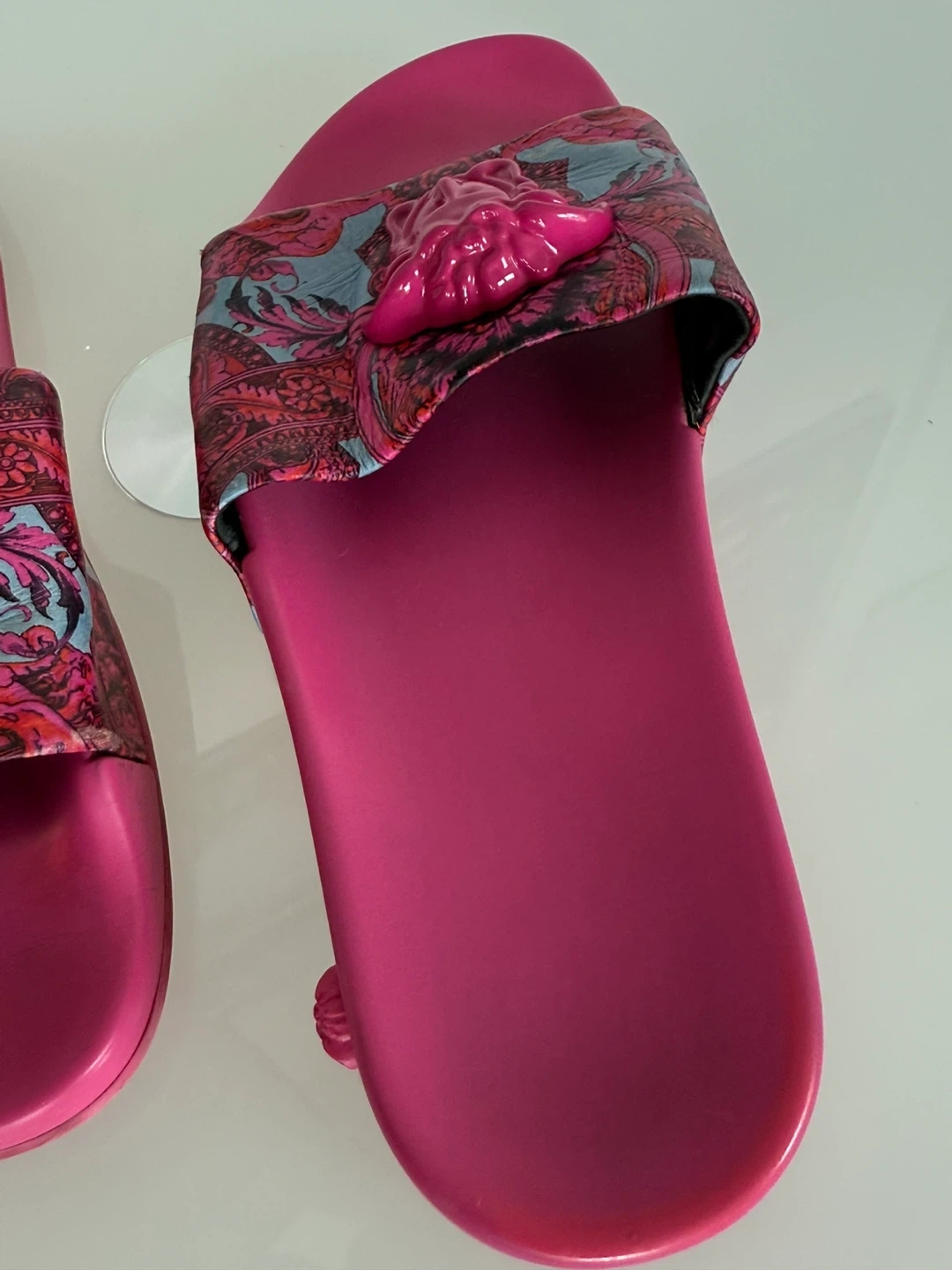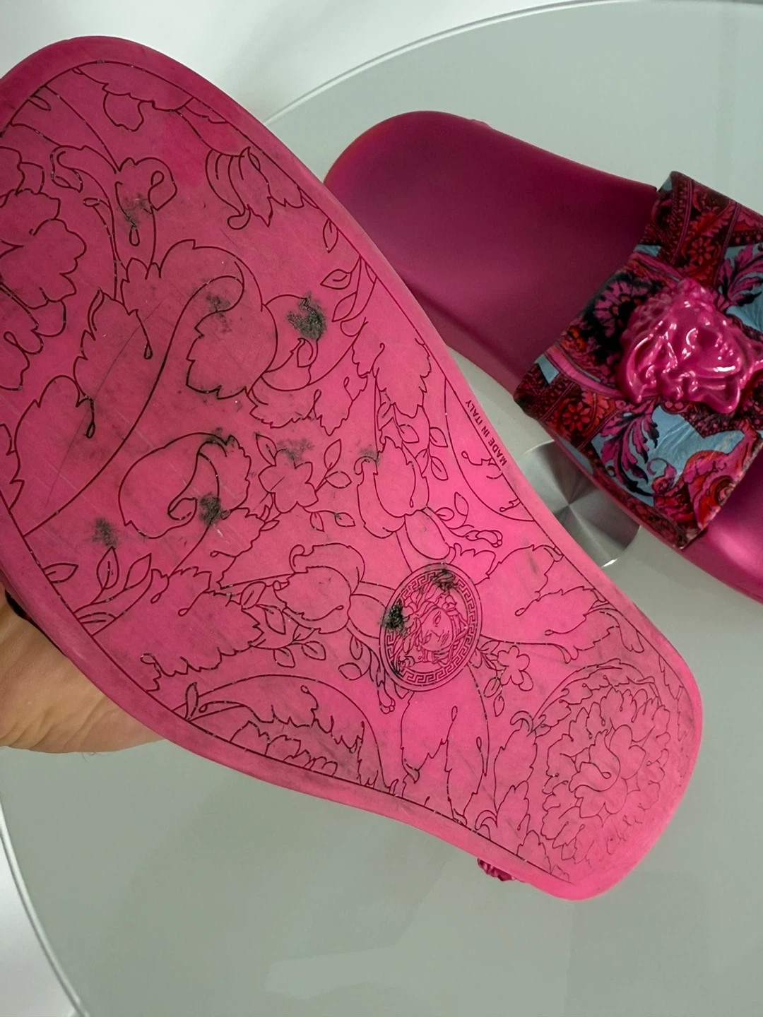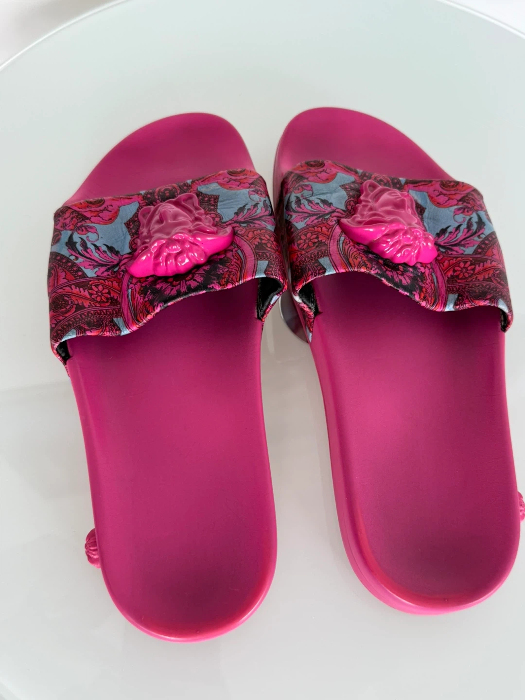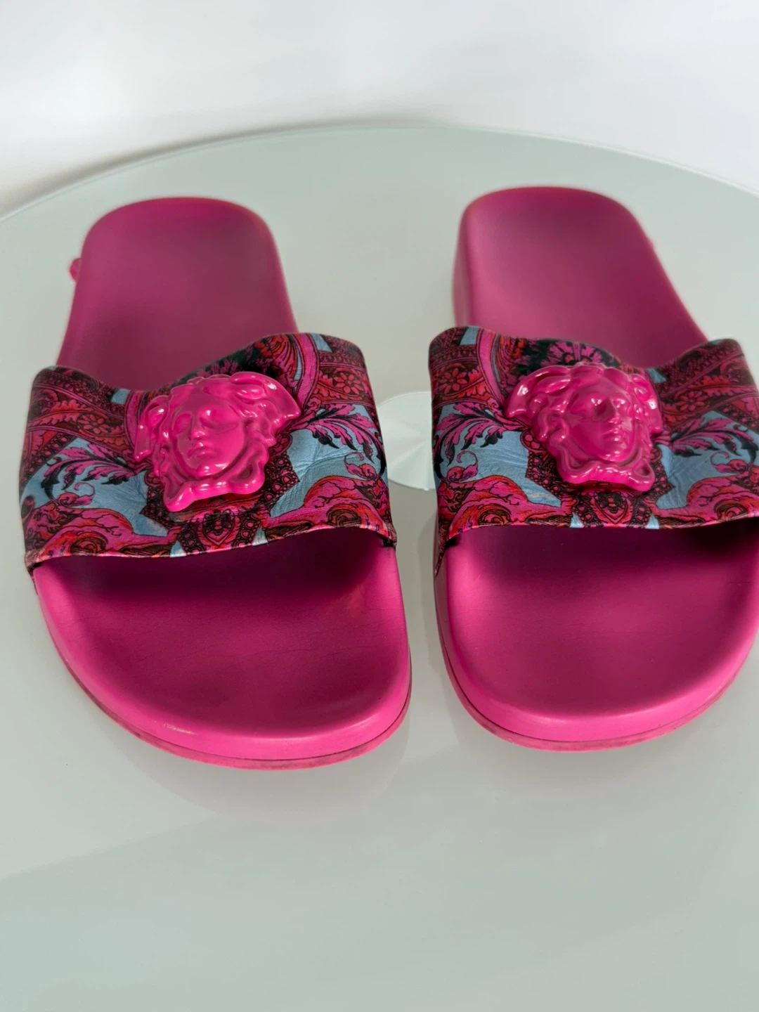 Versace Pink Baroque Leather Medusa Head Printed Slides Size: US 7 (37) Women Good condition 8/10 Location pick up Islington and Bloor
