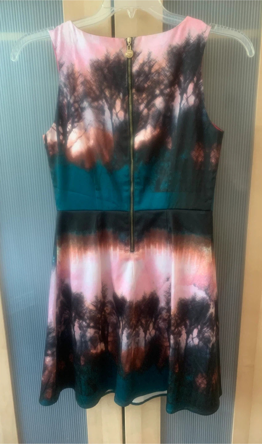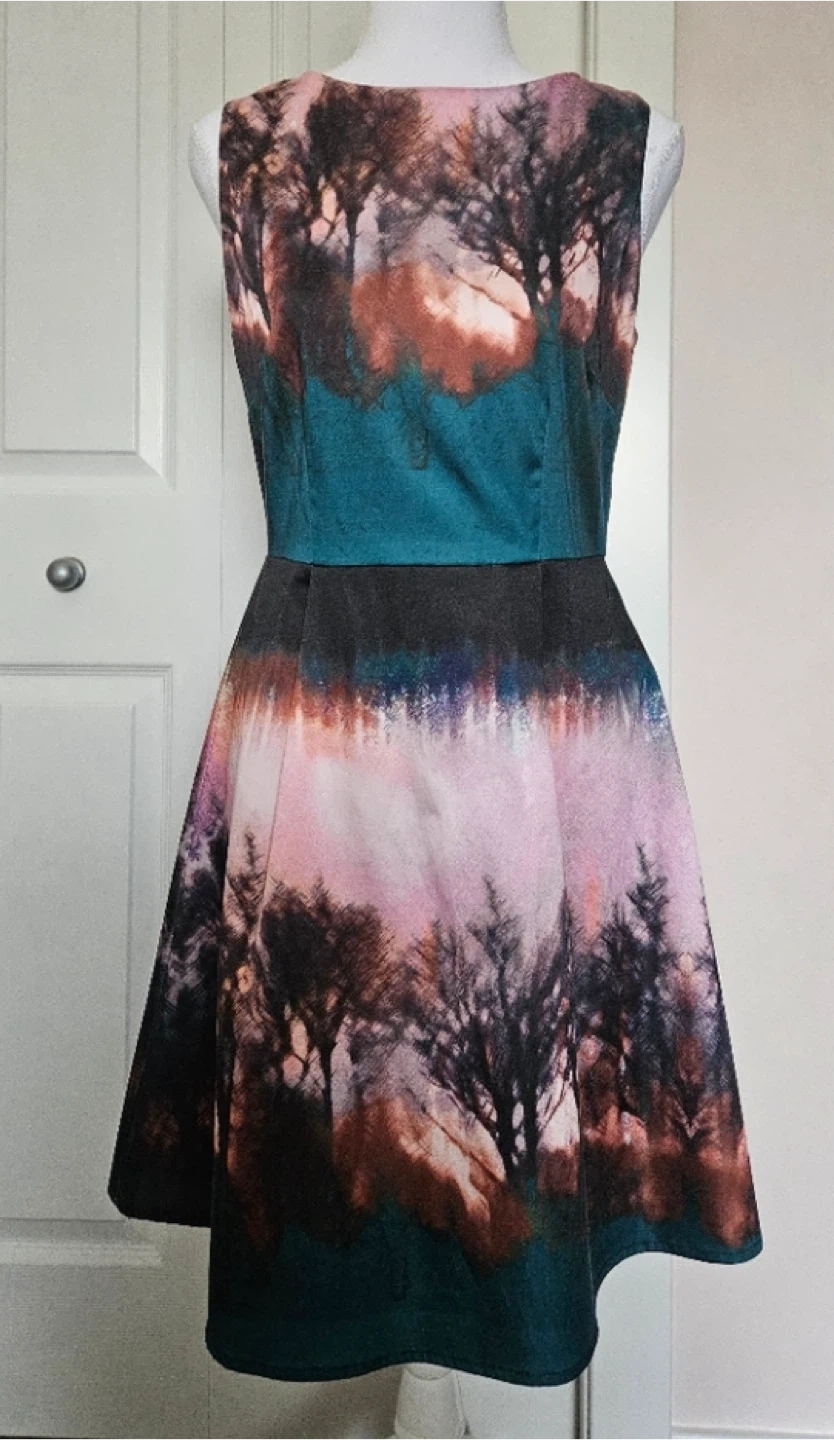 Cute Yumi dress in size S (US 2/4 or UK 10). The dress features a unique tree print and a flattering fit-and-flare silhouette. Perfect for a special occasion or a night out.