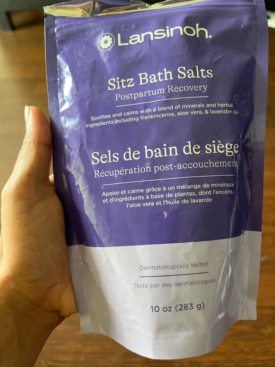 Selling a bag of Lansinoh Sitz Bath Salts for postpartum recovery. It soothes and calms with a blend of minerals and herbal ingredients including frankincense, aloe vera, and lavender oil. Contains 10 oz (283 g).
