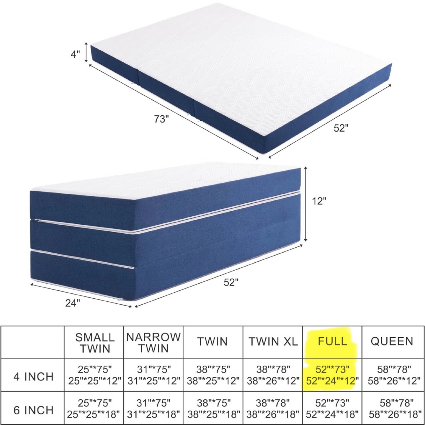 Full Folding Mattress – 4” Tri-Fold Memory Foam, Washable Cover