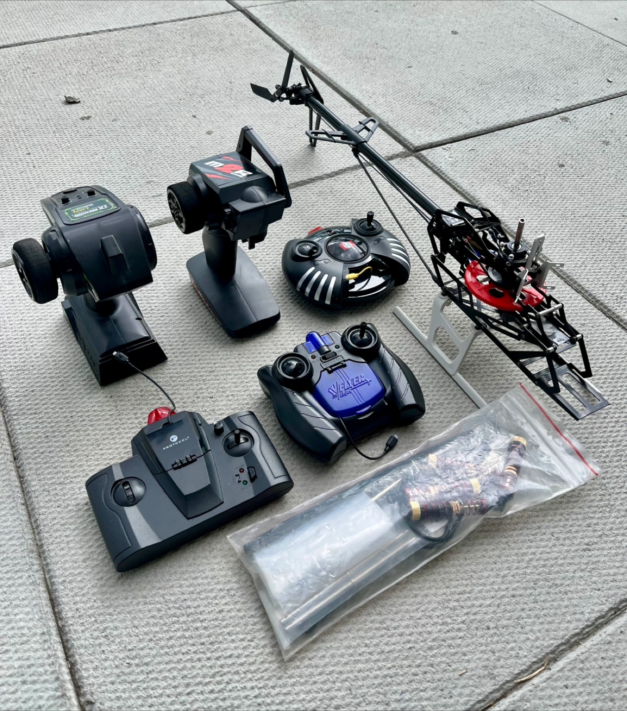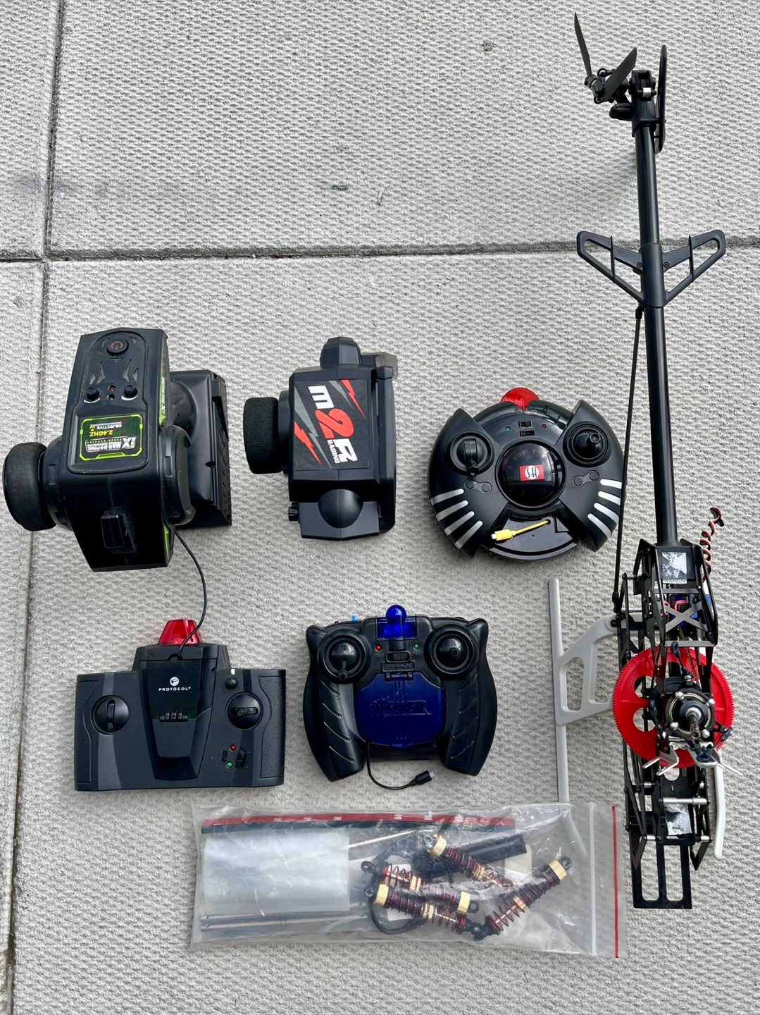 Selling a used RC controllers plus the skeleton of RC Helicopter(for parts). It comes with multiple controllers and a bag of spare parts. Great for hobbyists!