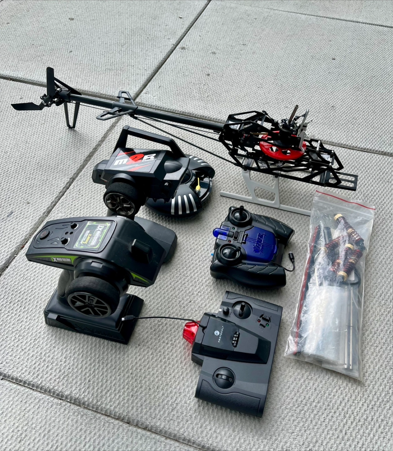 Selling a used RC controllers plus the skeleton of RC Helicopter(for parts). It comes with multiple controllers and a bag of spare parts. Great for hobbyists!