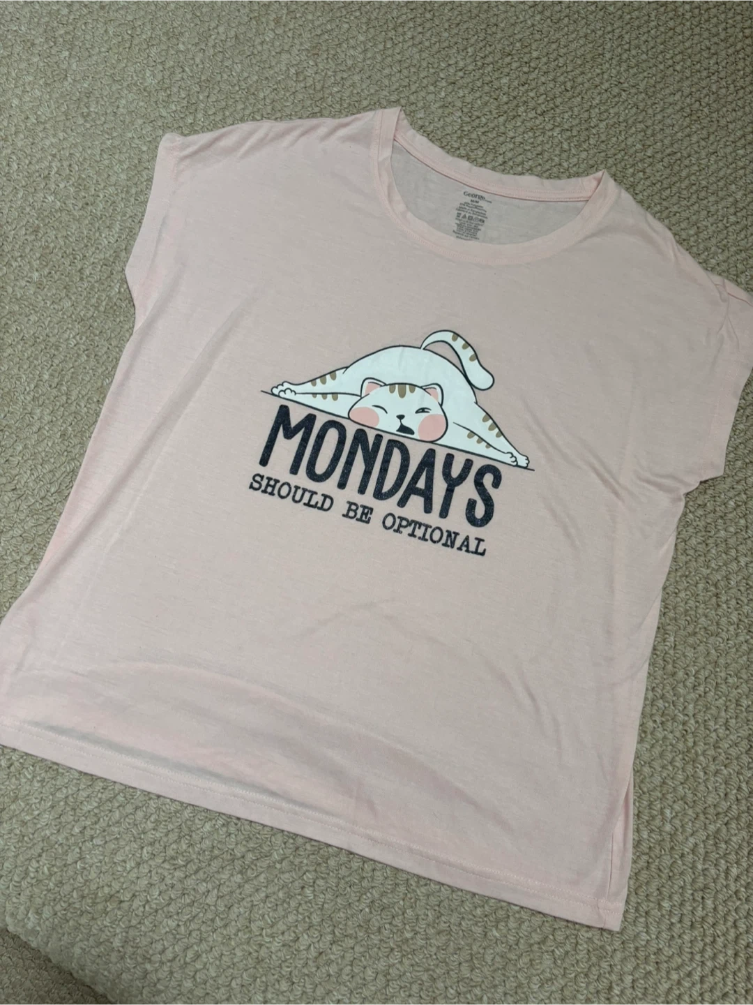 Selling a cute George brand women's T-shirt. It's a light pink colour with a graphic of a cat and the words "Mondays should be optional". Size is Medium. Great for casual wear - NEVER WORN (BRAND NEW)